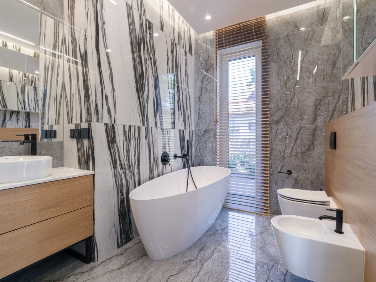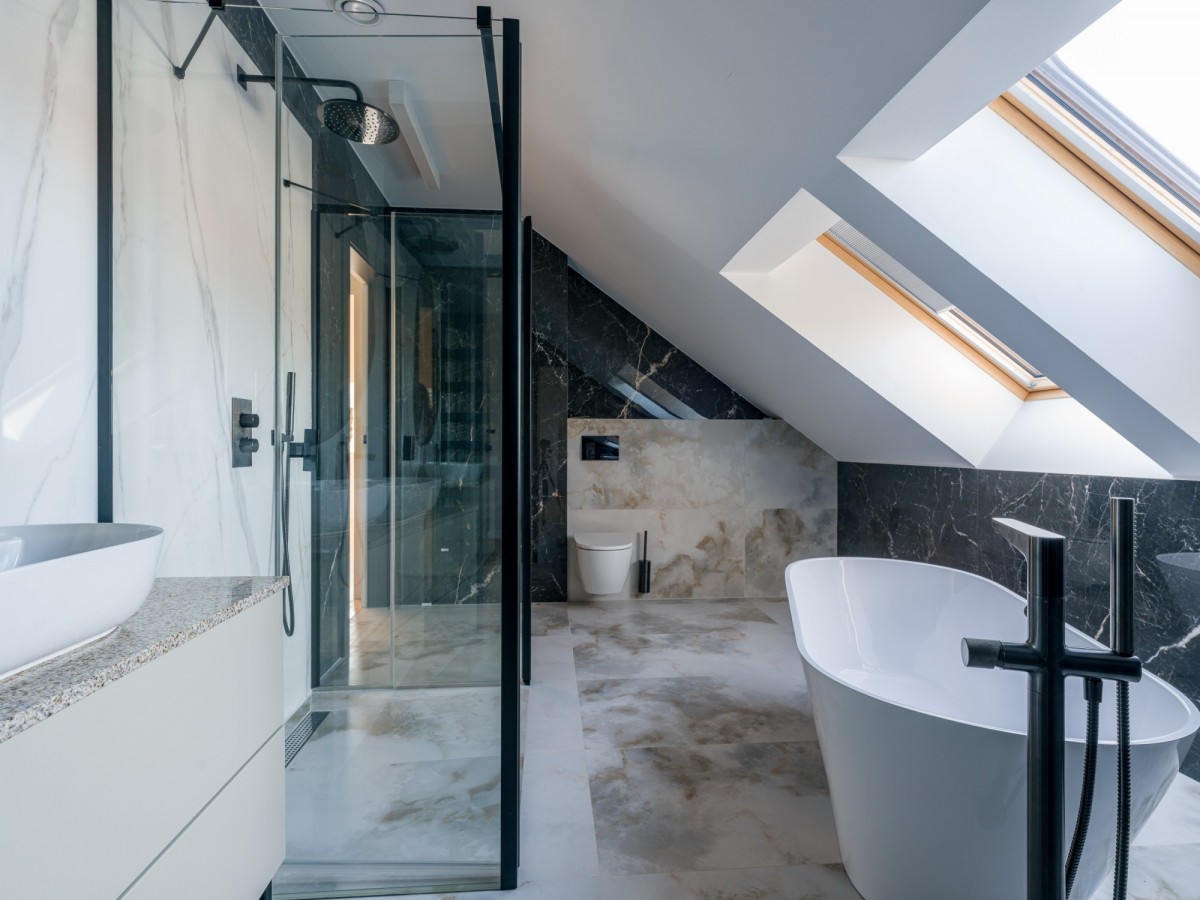 • łazienki wykończone płytami wielkoformatowymi, baterie podtynkowe, kamienne blaty