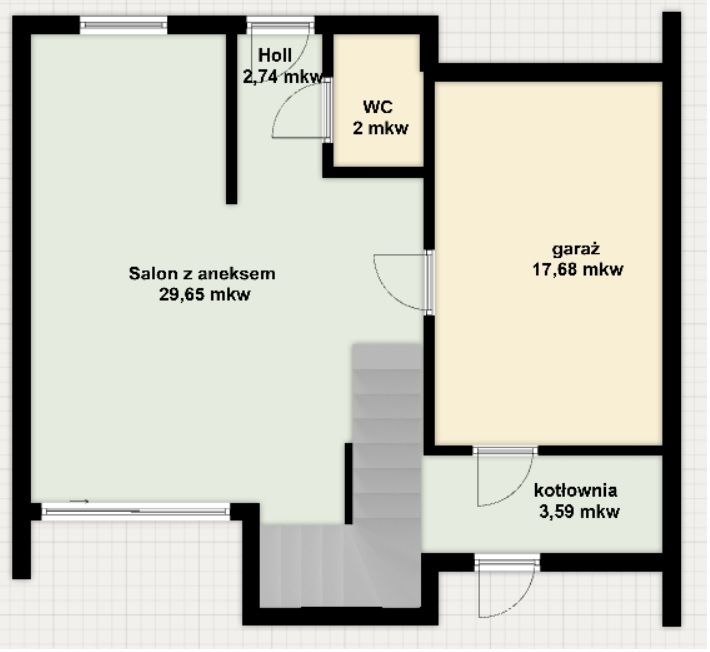 – na parterze salon z aneksem kuchennym z wyjściem do ogródka, toaleta, garaż, pomieszczenie techniczne z drugim wyjściem na ogródek;