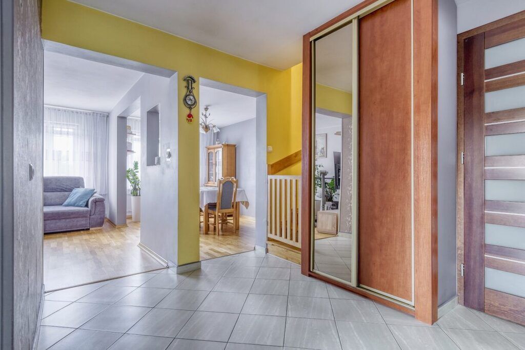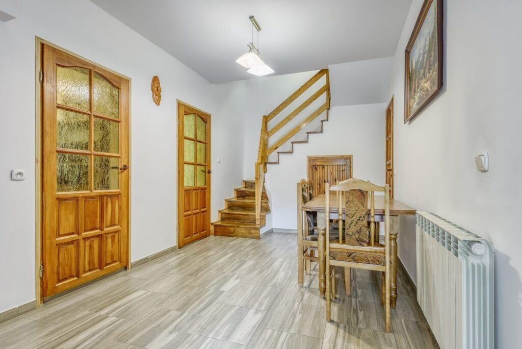 Poziom posiada oddzielne wejście, istnieje również przejście na piętro dębowymi schodami. Drzwi wejściowe, antywłamaniowe.