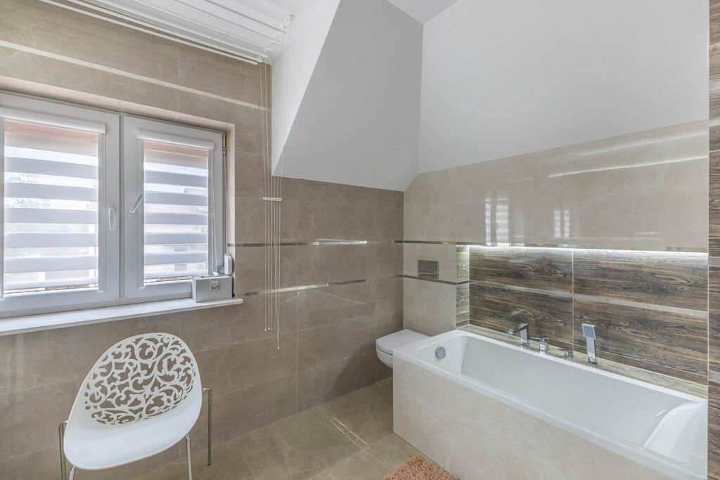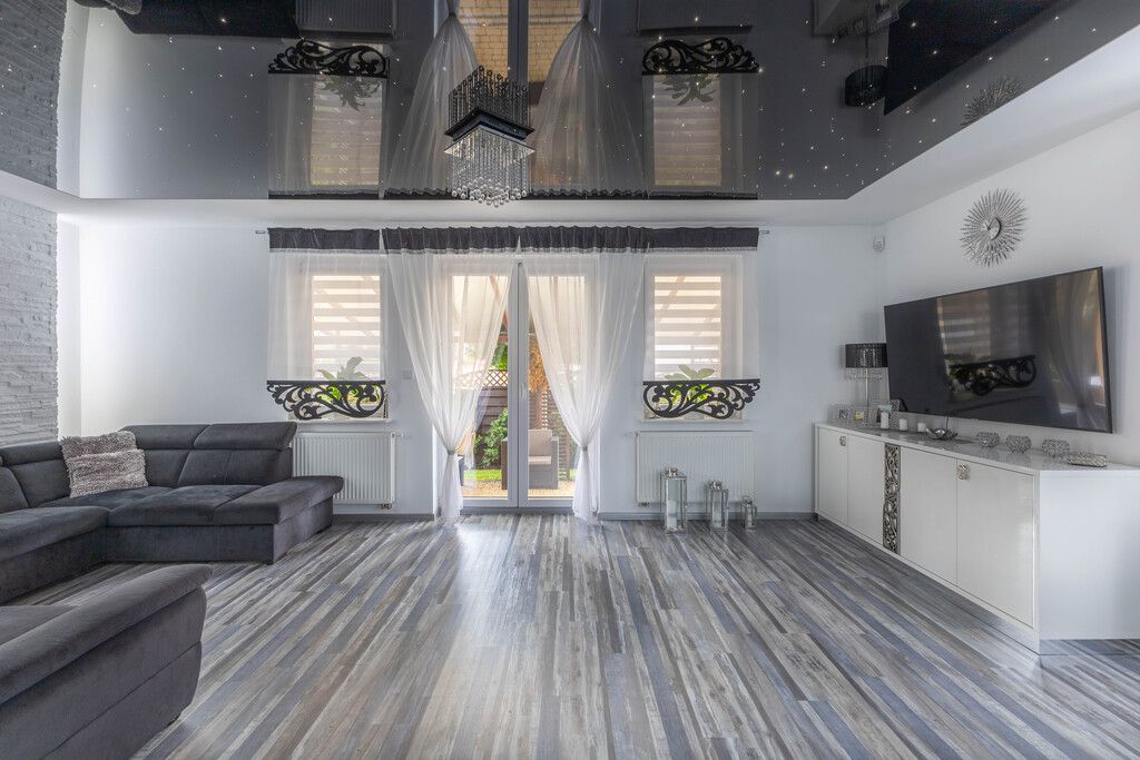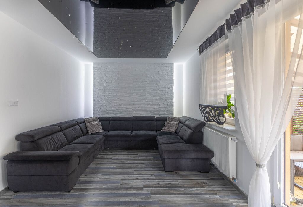 Wieczory zyskują niepowtarzalny klimat dzięki napinanemu sufitowi z efektem rozgwieżdżonego nieba, który tworzy wyjątkową atmosferę relaksu. Komfort podnosi również ogrzewanie podłogowe na parterze, a w jednej z sypialni zainstalowano klimatyzację – idealną na letnie dni.