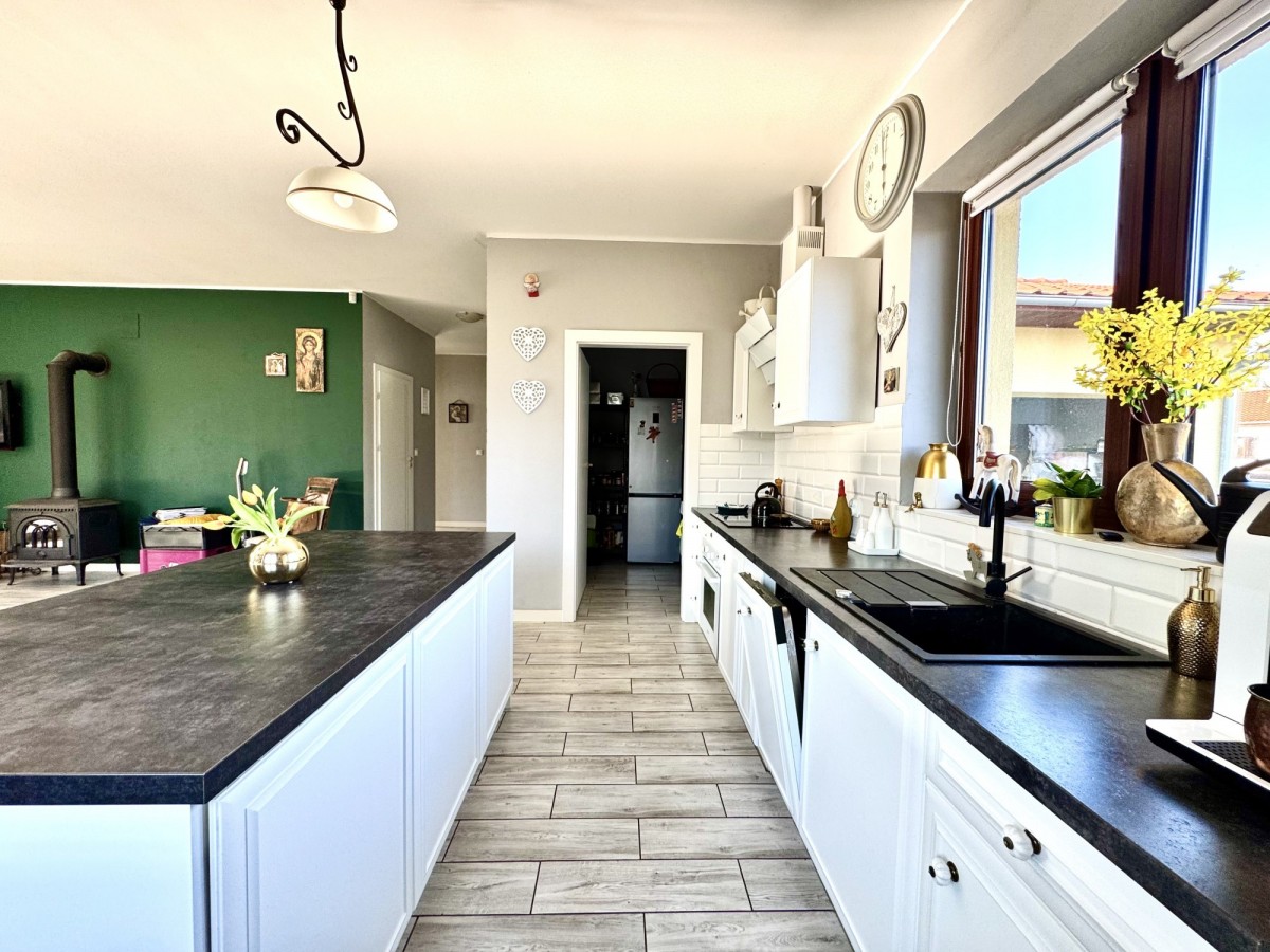Duża, otwarta kuchnia z wyspą – serce domu, idealne do wspólnych posiłków i spotkań.
