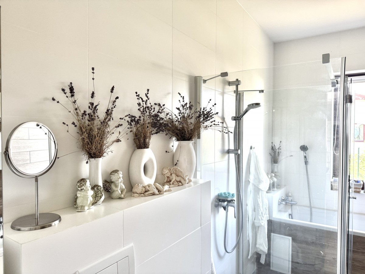 Łazienka z prysznicem oraz wanną + toaleta dla gości.