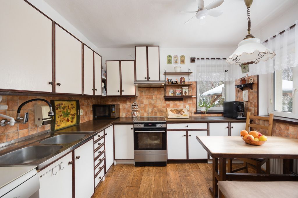 Dom został wybudowany z cegły i drewna, wyposażony w okna PCV. Garaż z kanałem daje dodatkowe możliwości użytkowe, szczególnie dla osób majsterkujących lub potrzebujących przestrzeni technicznej.