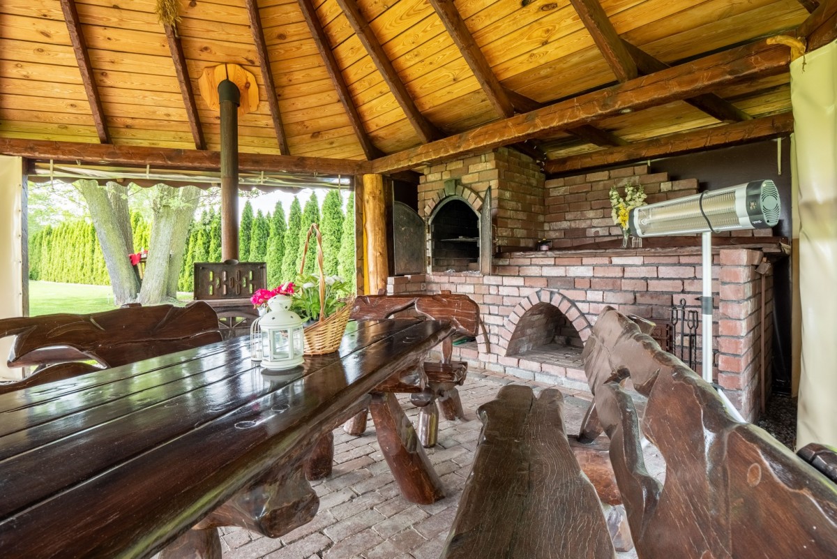 Altana z grillem, wędzarnią, paleniskiem ogniska oraz dekoracyjna cegłą rozbiórkową o historycznym pochodzeniu. Doprowadzony do innego prądu, zamontowany element ogrzewający, który uprzyjemni spędzanie czasu w chłodniejszych dniach/wieczorach. Właściciele zadbali o drobne oświetlenie altany w postaci współgrającego z całością żyrandola. Dodatkowe oświetlenie ogrodu halogenowego. Liczne miejsca postojowe na podjeździe.