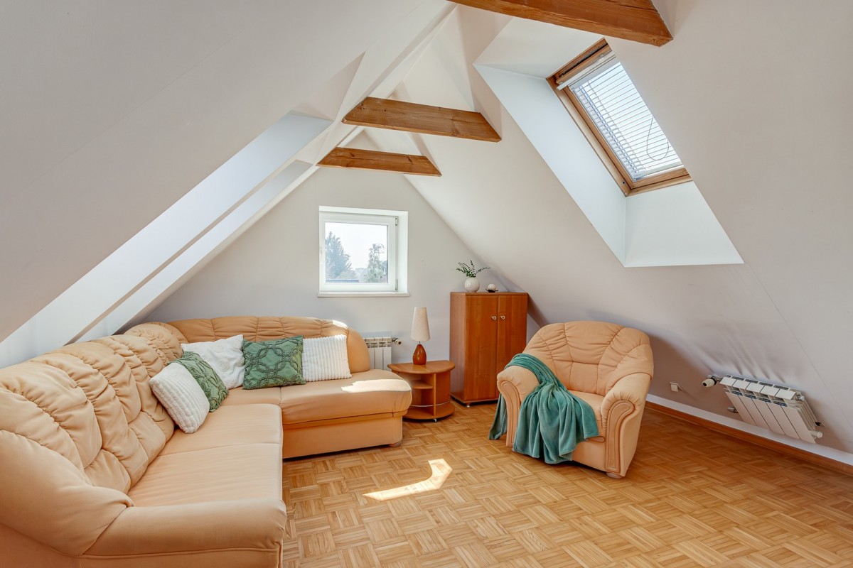 Okna: PCV dwuszybowe, duża ilość naturalnego światła, w tym 10 okien płaciowych (dachowych).