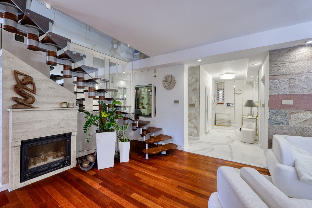 – salon z kominkiem i płaszczem wodnym, z wyjściem na taras z egzotycznego drewna,