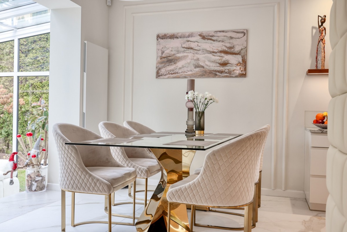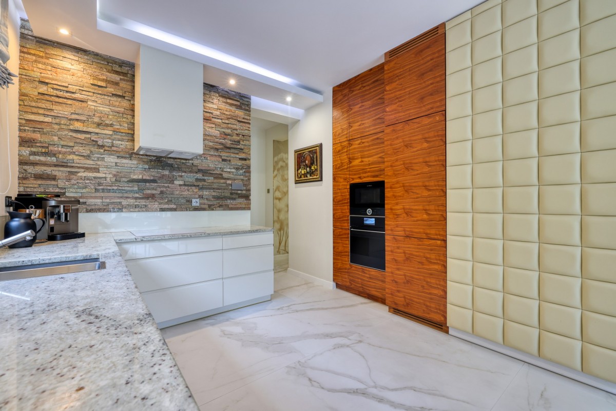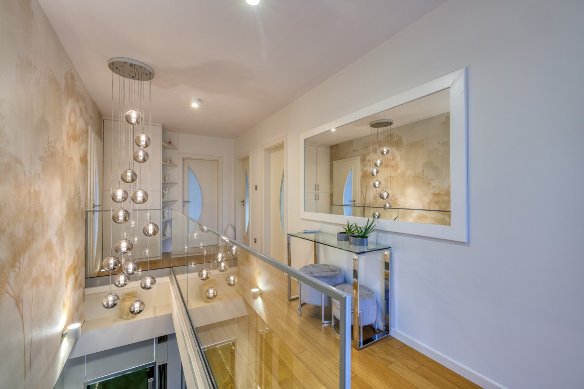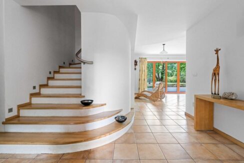 Wyjątkowa nieruchomość wybudowana została w bardzo eleganckim stylu i wysokim standardzie, zgodnie z indywidualnym projektem właściciela, w otoczeniu zieleni i starodrzewia. Dom został wykończony z wysokiej jakości materiałów i przemyślanych rozwiązań. Na szczególną uwagę zasługują podłogi i ściany wykonane z egzotycznego drewna, kamienia naturalnego, spieków kamiennych oraz skóry. Wielkoformatowe okna dzięki którym wnętrza są bardzo dobre doświetlone zostały wykonane z pierwszej jakości drewna egzotycznego. Blaty kuchenne i łazienkowe to piękny naturalny kamień.