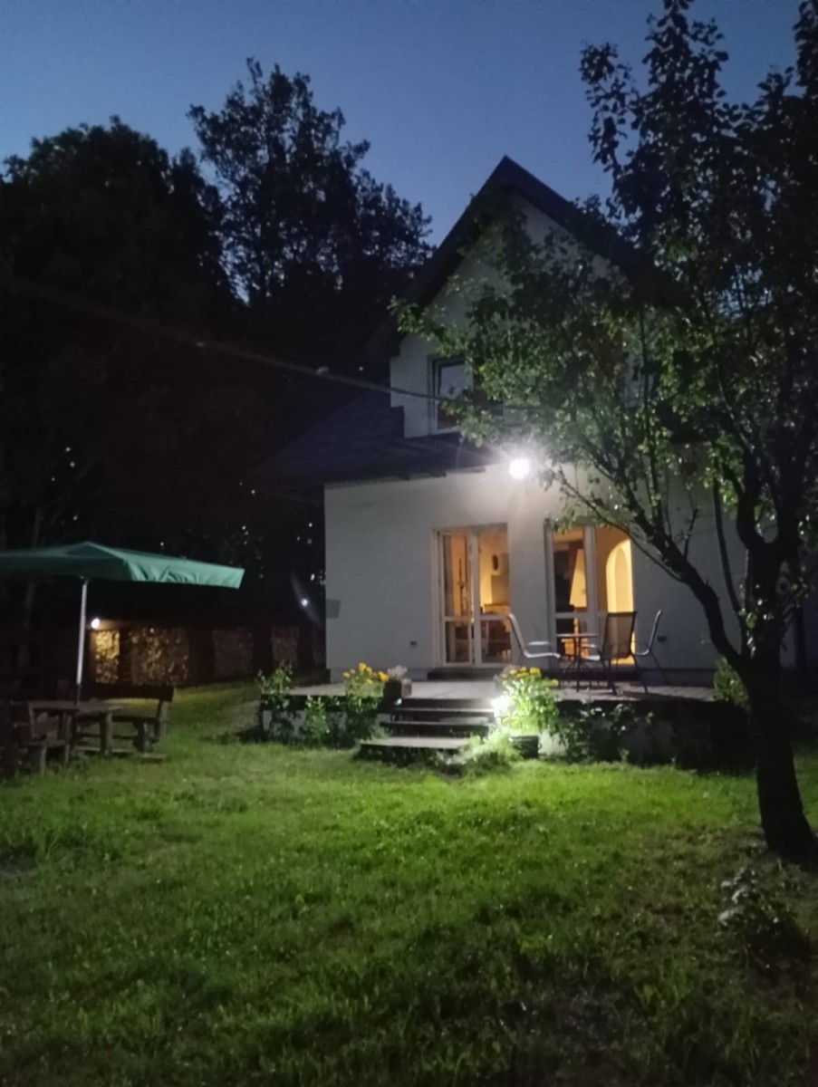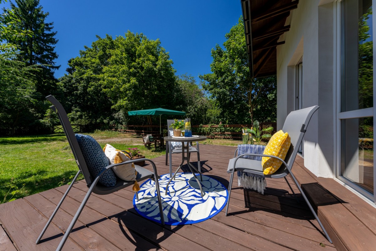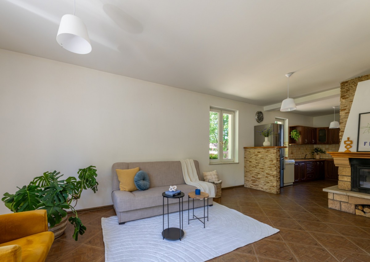 – salon (36 m²) z jadalnią, kominkiem, wyjściem na taras, ogród, las i ścieżkę ścieżkę spacerową (zimą z tej strony codzienne piękne spektakle zachodzącego słońca)
