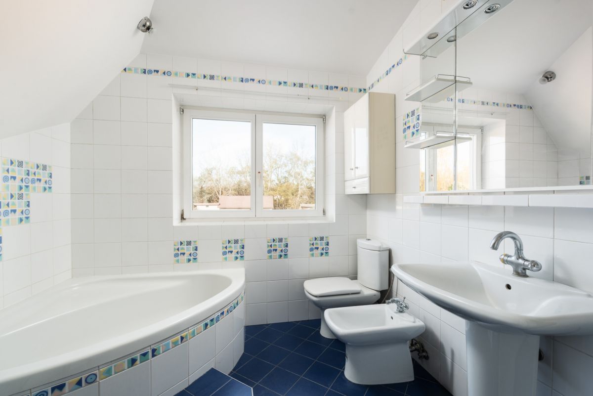 Do nieruchomości przynależy garaż w bryle budynku na dwa samochody oraz podjazd mieszczący dodatkowe auta. Z salonu prowadzi wyjście na taras z widokiem na ogród — idealne miejsce na poranną kawę lub letnie kolacje w gronie bliskich. Dom posiada ogrzewanie gazowe (piec dwufunkcyjny), ogrzewanie podłogowe w kuchni i łazienkach, drewniane okna oraz liczne szafy w zabudowie. Całość otoczona jest bujną roślinnością z pięknie zadbanym trawnikiem oraz żywopłotem.