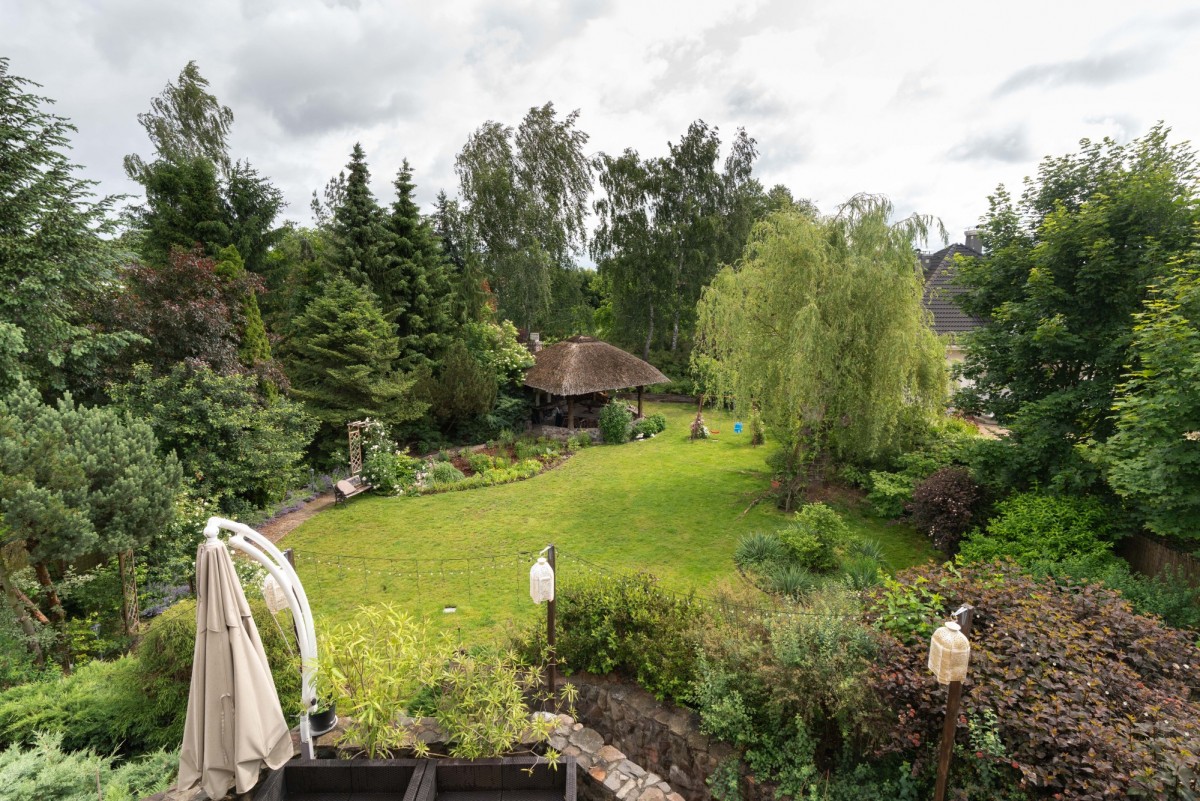 Na działce znajduje się altana z murowanym grillem, dębowy stół z 12 krzesłami oraz huśtawka.