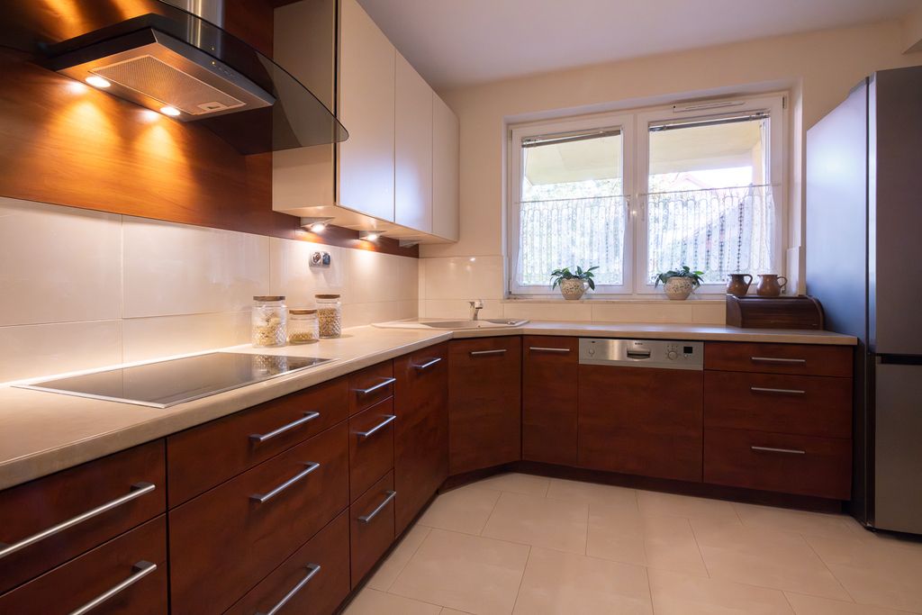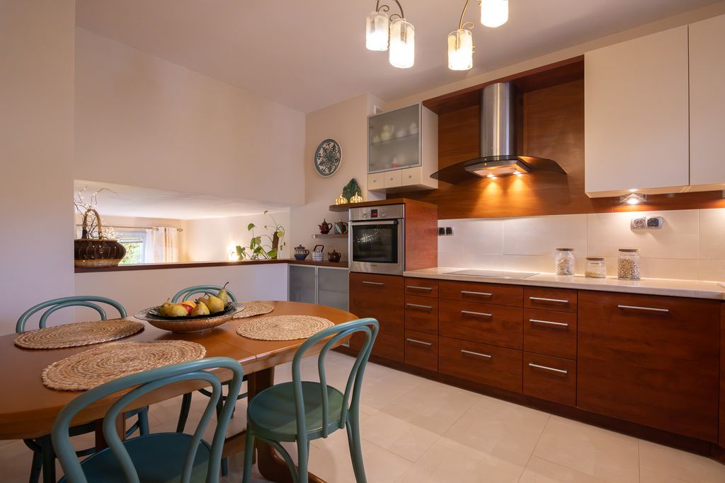 Bardzo duża kuchnia z miejscem do codziennych posiłków idealna będzie dla dużej rodziny.