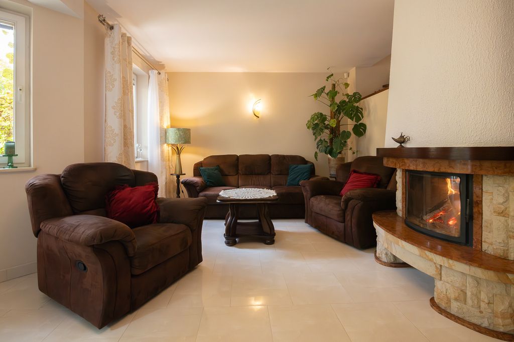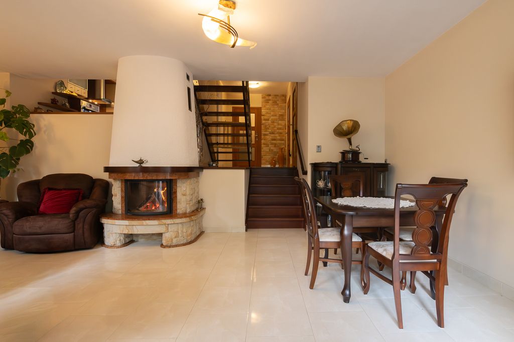 Duży salon z jadalnią i kominkiem oraz ogrzewaniem podłogowym tworzy przytulną atmosferę, a duże okna zapewniają świetne doświetlenie wnętrz.