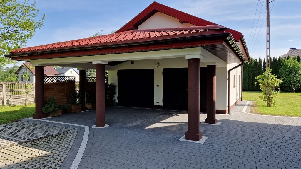 Oprócz domu na działce posadowiony jest osobny budynek z garażem dwustanowiskowym , z wiatą na 2 auta i dodatkowym pomieszczeniem, które może być wykorzystane jako warsztat, spiżarka, magazyn itp.