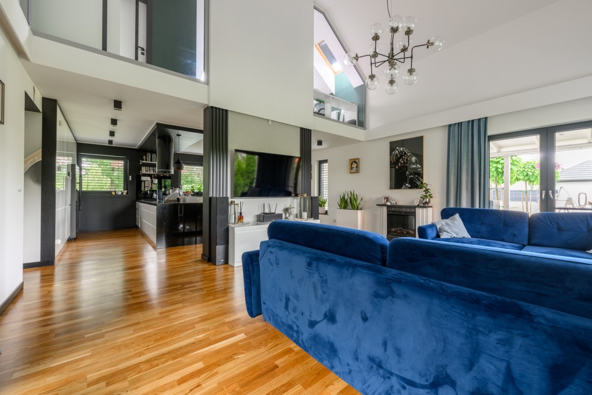 - Przestronny salon z wysoką antresolą i wyjściem na taras