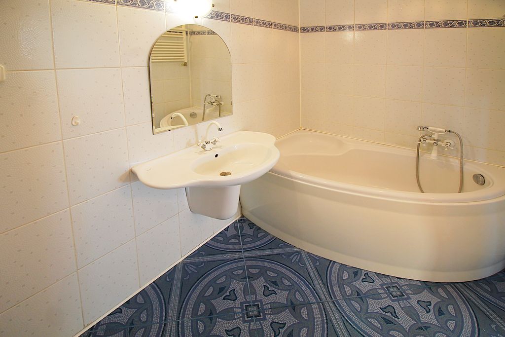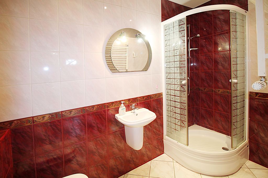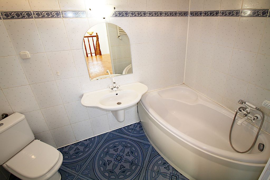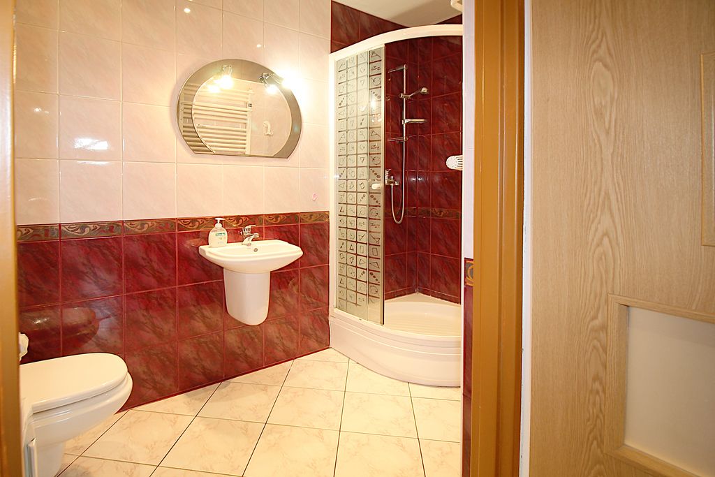 Dwa poziomy, dwie łazienki (dolna z prysznicem i WC, górna z wanną i WC).