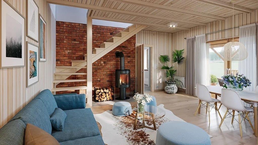 PARTER: Salon z kominkiem, sypialnia, kuchnia, łazienka.