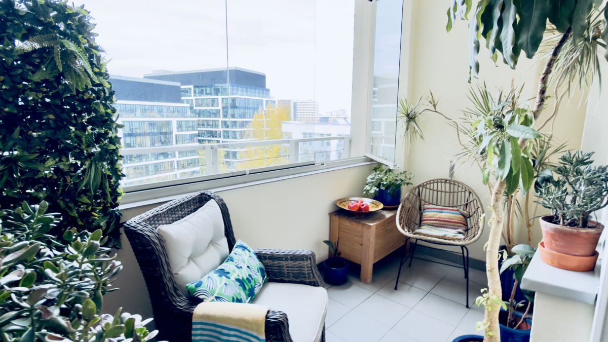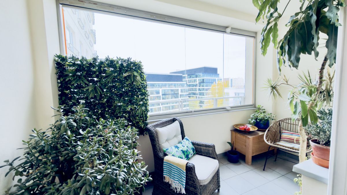 – Zabudowany balkon z widokiem na zielone patio