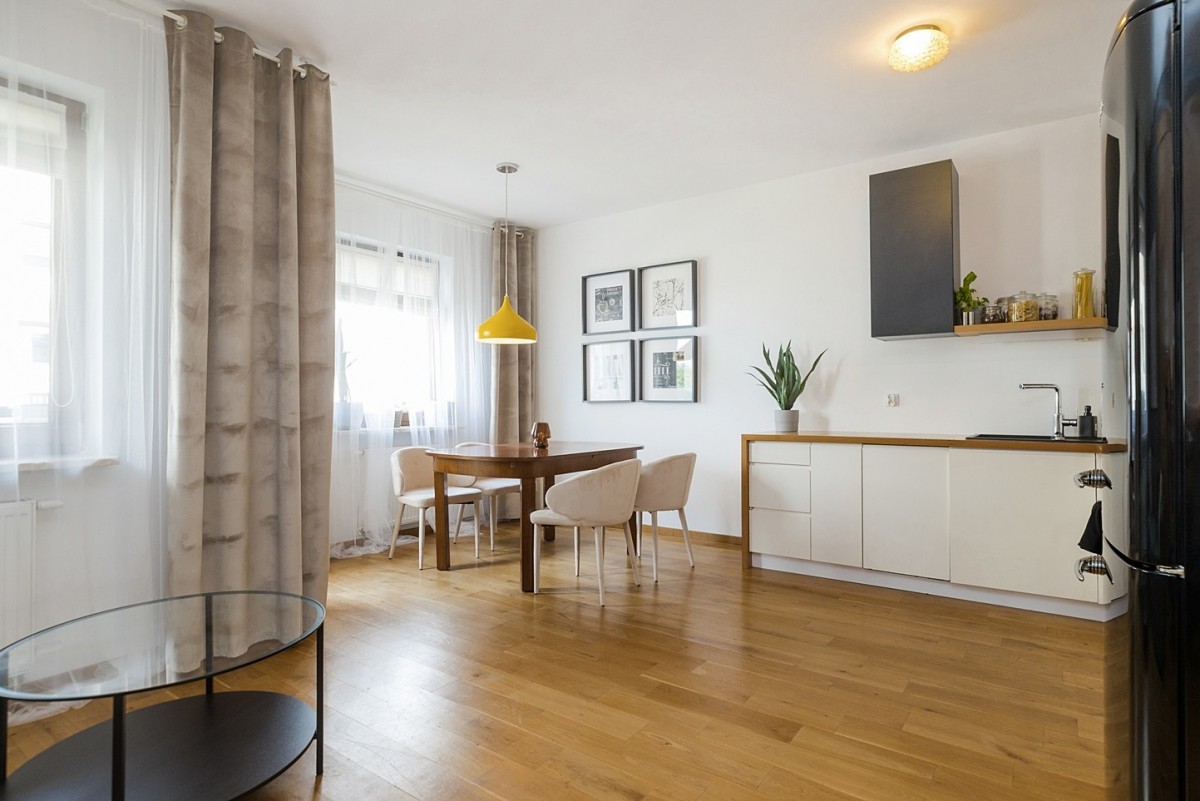 Mieszkanie jest jasne, zadbane i gotowe do zamieszkania. Duże okna zapewniają doskonałe doświetlenie wnętrz, a całość dopełnia naturalna dębowa podłoga oraz subtelne wykończenie inspirowane stylem retro, wprowadzające przytulny klimat. Układ mieszkania sprzyja wygodnemu życiu na co dzień, zarówno dla singla, pary, jak i osób pracujących zdalnie.