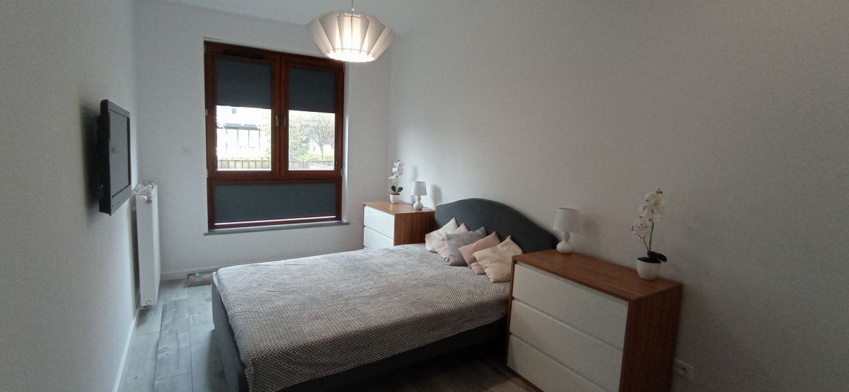 Do wynajęcia słoneczne, przestronne, dwupokojowe mieszkanie o powierzchni 43,4 m2, położne na parterze w apartamentowcu z 2013 roku w miasteczku Wilanów.