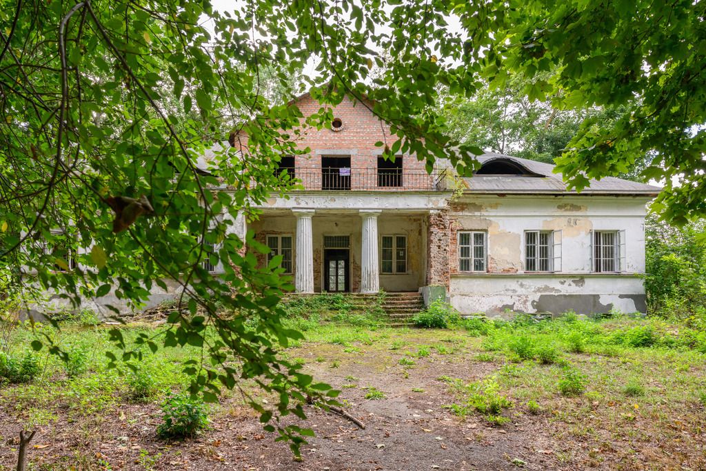 The manor house is a single-story structure, built of brick and plastered, with a regular rectangular plan and a residential attic. The entire structure has a basement and is covered with a hipped sheet metal roof. The front elevation has nine window axes, with a central projection containing a two-column, Doric, recessed portico supporting a terrace in front of the first-floor extension. The extension is topped with a triangular gable with a decorative oculus. The rear elevation features a portico similar to the front one, but in the Tuscan order. The interior layout is two-bay, with a corridor separating the bays, and with hallways and a living room on the axis. The entire structure is maintained in the spirit of Classicism.