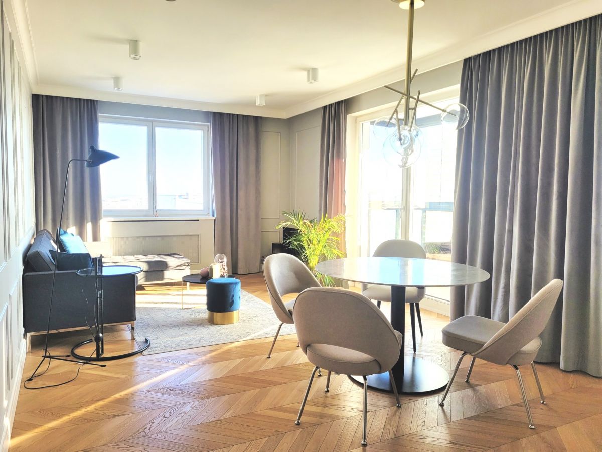 Do wynajęcia od zaraz eleganckie mieszkanie dwupokojowe z otwartą widną kuchnią, które zostało urządzone w nowoczesnej klasycznej stylistyce wraz z przynależną loggią o powierzchni ok 7m2. Do dyspozycji najemcy jest jedno miejsce parkingowe w garażu podziemnym i komórka lokatorska ok 4m2, które są wliczone w cenę najmu. Mieszkanie jest kompletnie umeblowane i bogato wyposażone. Widna kuchnia częściowo otwarta na salon, która jest zabudowana meblami na wymiar wraz z AGD firmy Bosch w zabudowie (duża zmywaka 65 cm). Mieszkanie jest wykończone w spójnym stylu, wysokim standardzie z dbałością o najlepszą jakość użytych materiałów i praktyczną funkcjonalność.