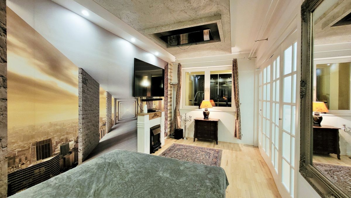 Sypialnia, w której znajduje się wygodne łóżko z materacem została doposażona w tworzący przytulny klimat bio kominek elektryczny. W sypialni znajdują się dwa telewizory w tym jeden podwieszany wygodny do oglądania w łóżku, super sprzęt audio i pojemna szafa w zabudowie.