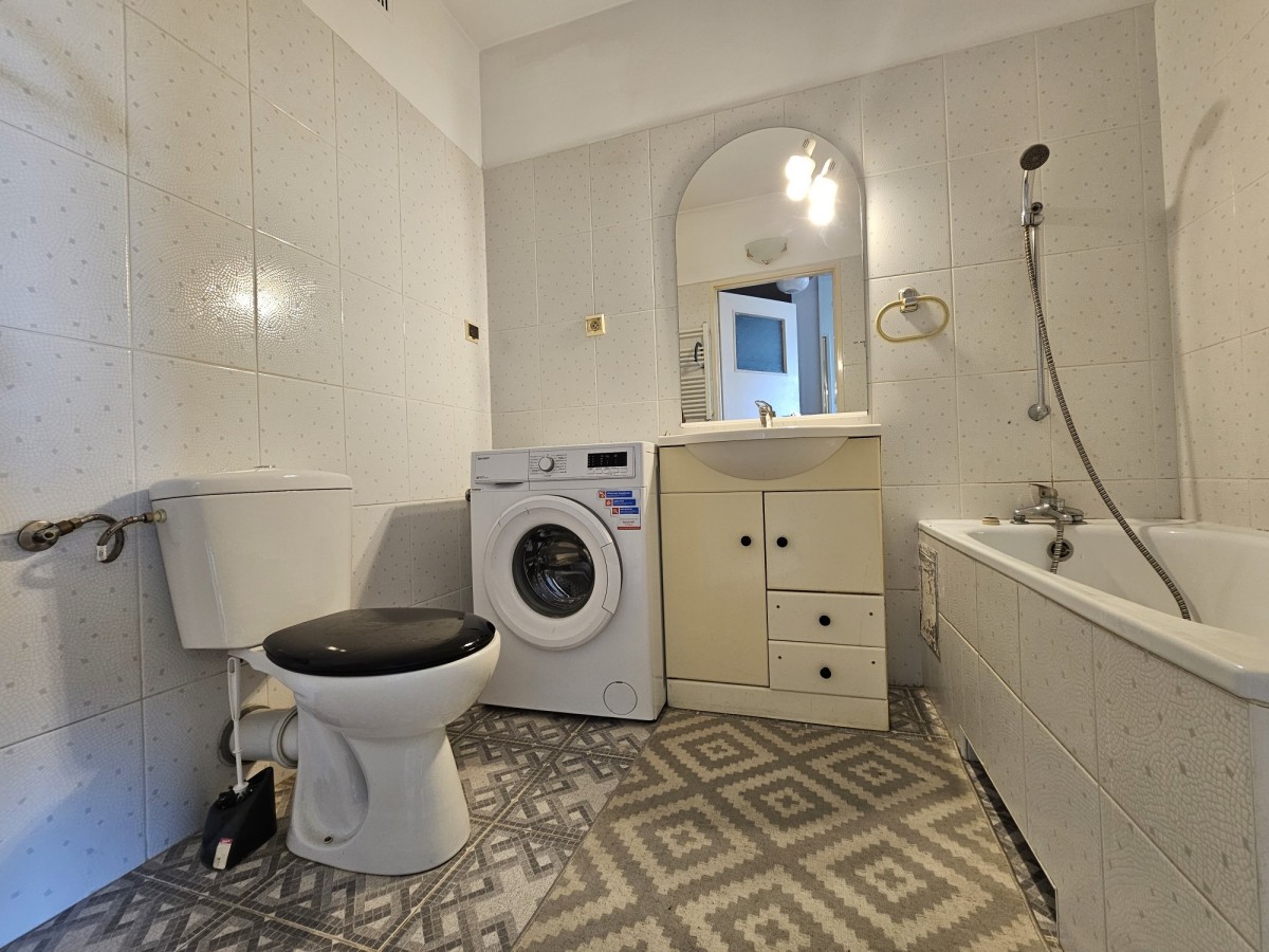 Łazienka z wanną, wyposażona w pralkę,