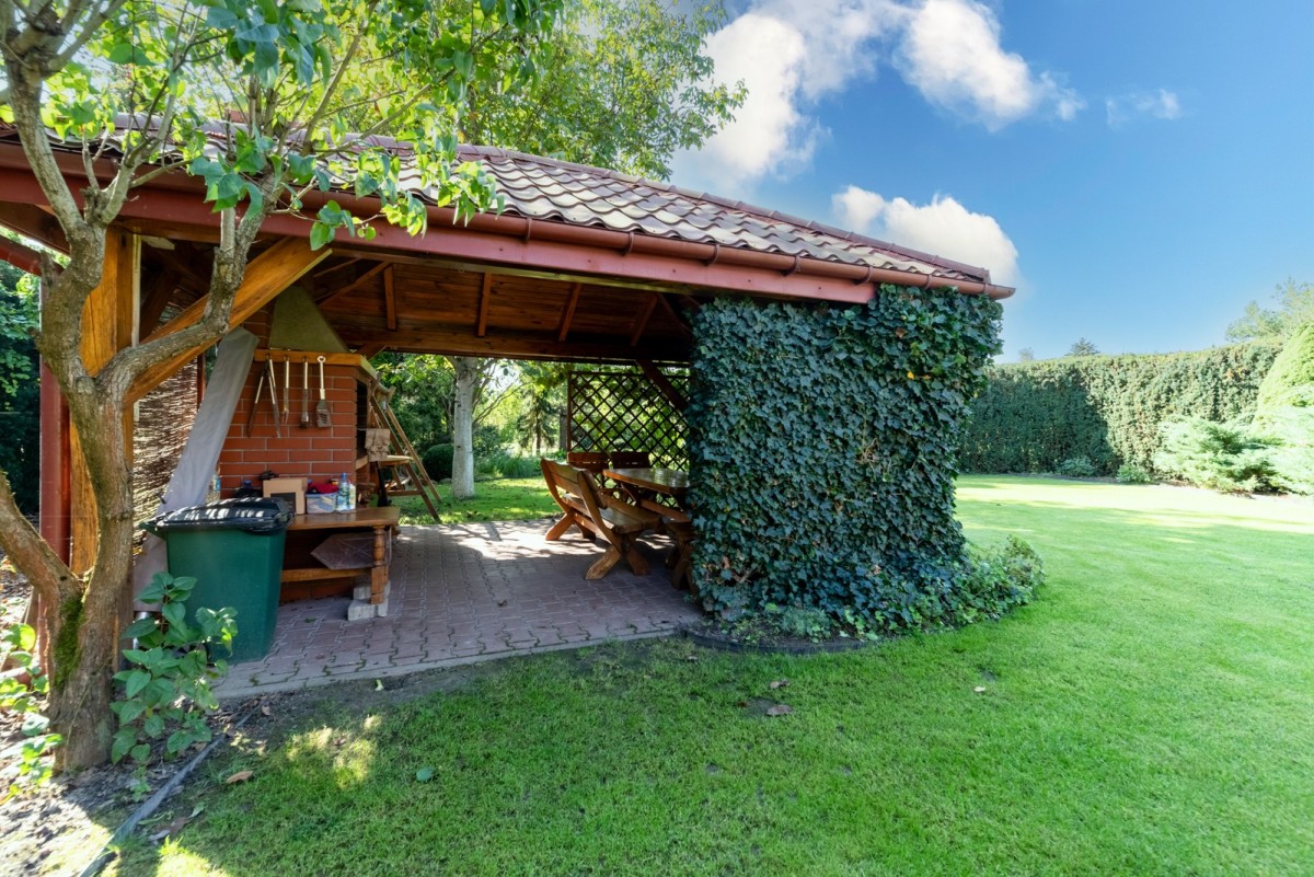 Dom jest bardzo dobrze utrzymany, a przylegający do domu ogród jest pięknie zagospodarowany z altanką, grillem, warzywniakiem i małym sadem. Podjazdy są wyłożone kostką brukową.