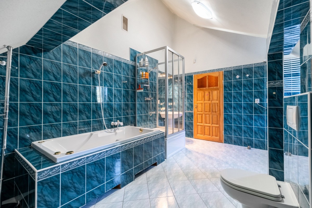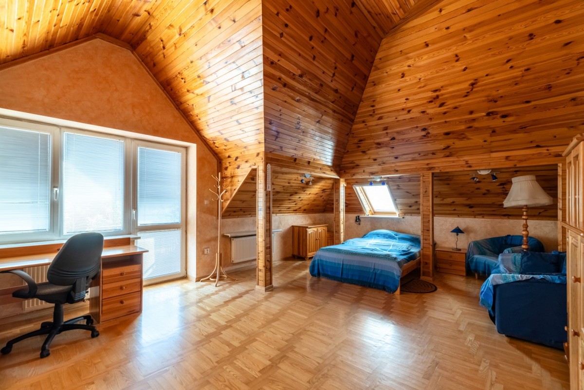 Na piętrze: 2 sypialnie (21 i 19m2) z własnymi garderobami i łazienkami, oraz dodatkowa sypialnia/gabinet (11m2) oraz wyjście na strych.