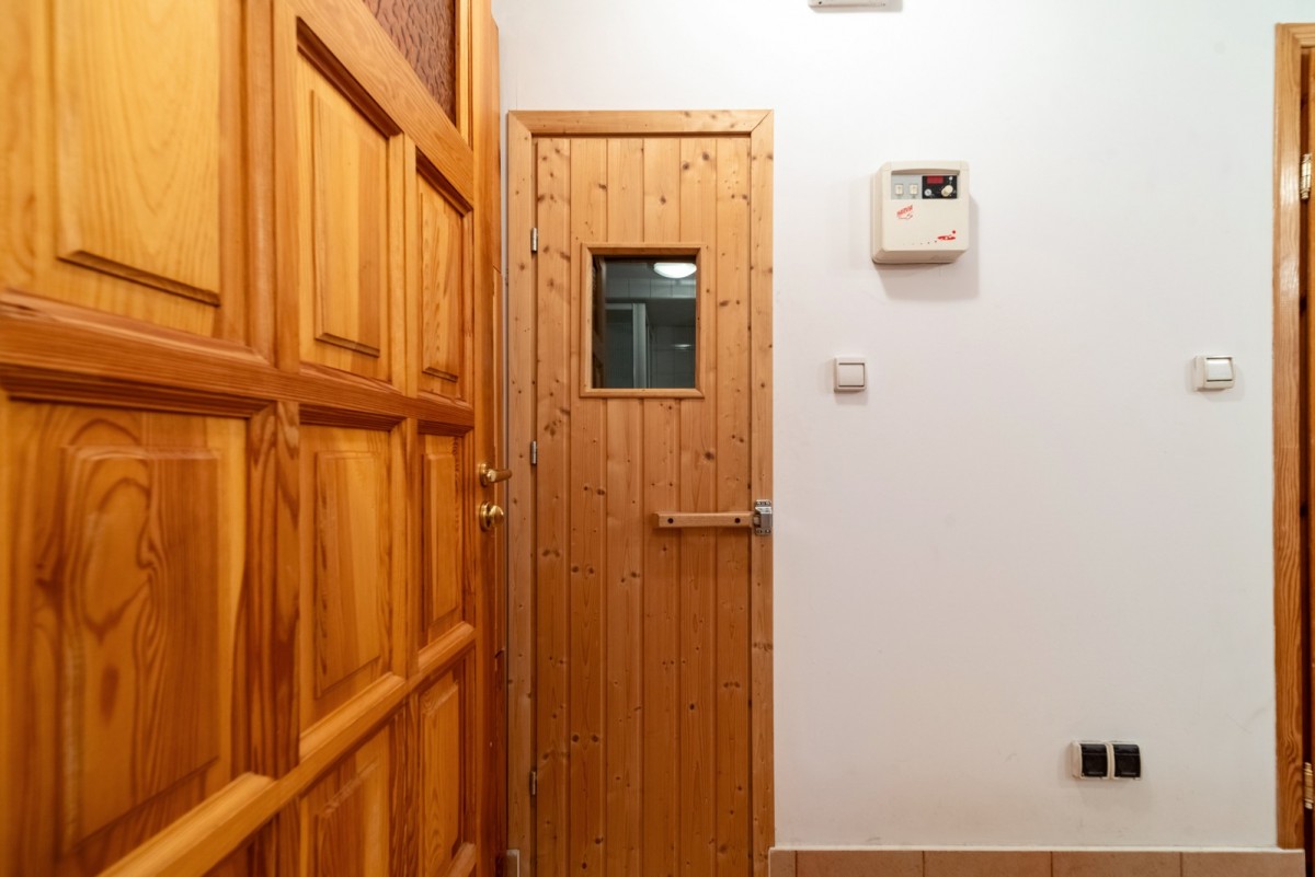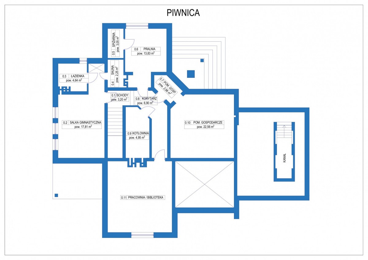 Dom jest częściowo podpiwniczony. W ładnie zagospodarowanym przyziemiu znajduje się salka do ćwiczeń (cały znajdujący się tam sprzęt zostaje w nieruchomości dla nowych właścicieli), pokój kominkowy (27m2), sauna, łazienka, pralnia, 2 spiżarnie oraz kotłownia.