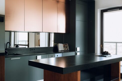 Na parterze część główna składająca się kuchni (20m2), dużego foyer (16m2), salonu z jadalnią (44m2) i wyjściem na taras prowadzącym do ogrodu oraz WC.