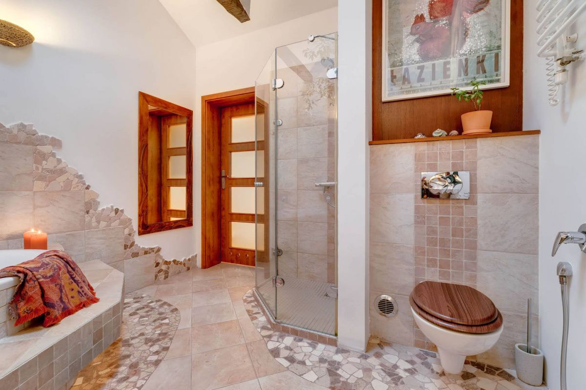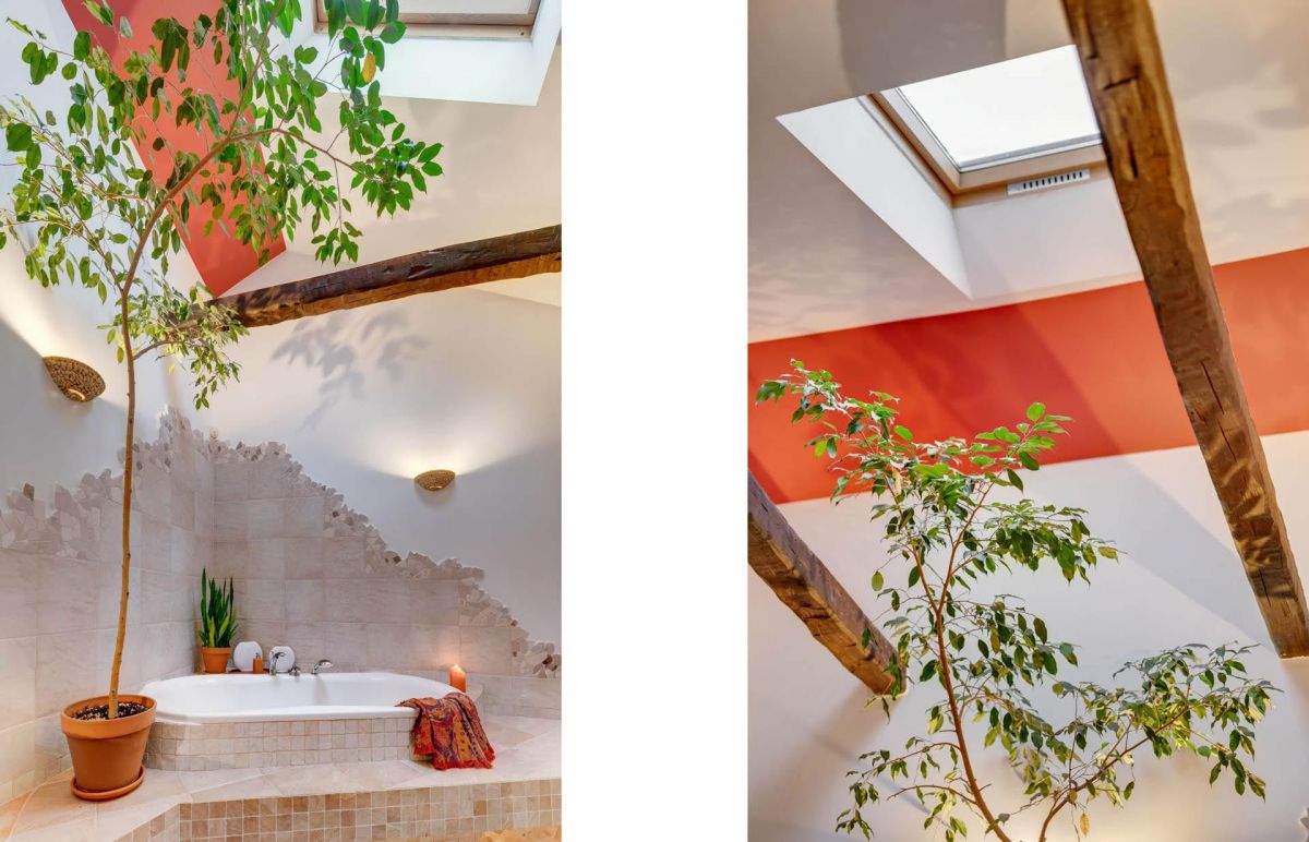 – efektowna łazienka typu domowe SPA z wysokimi sufitami, dużą wanną, roślinnością i oknem dachowym