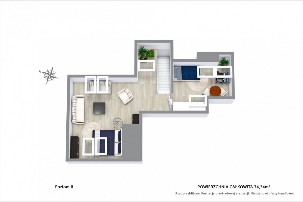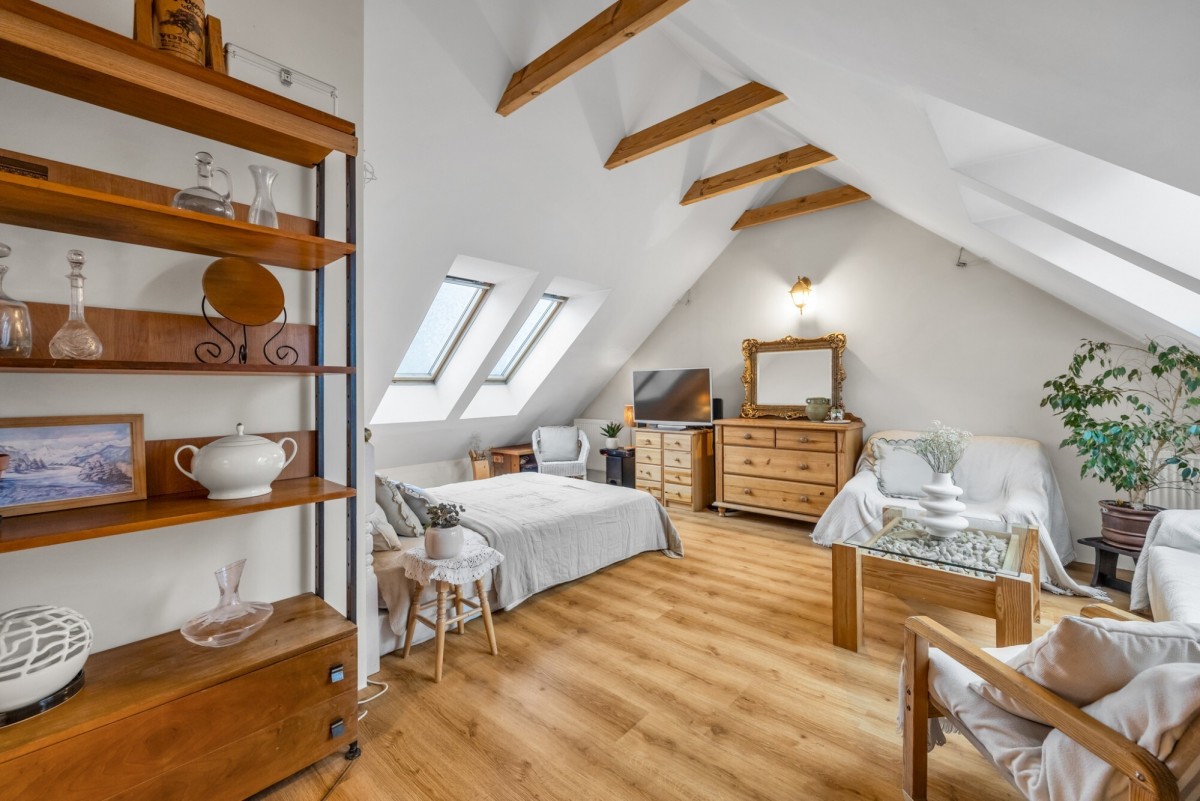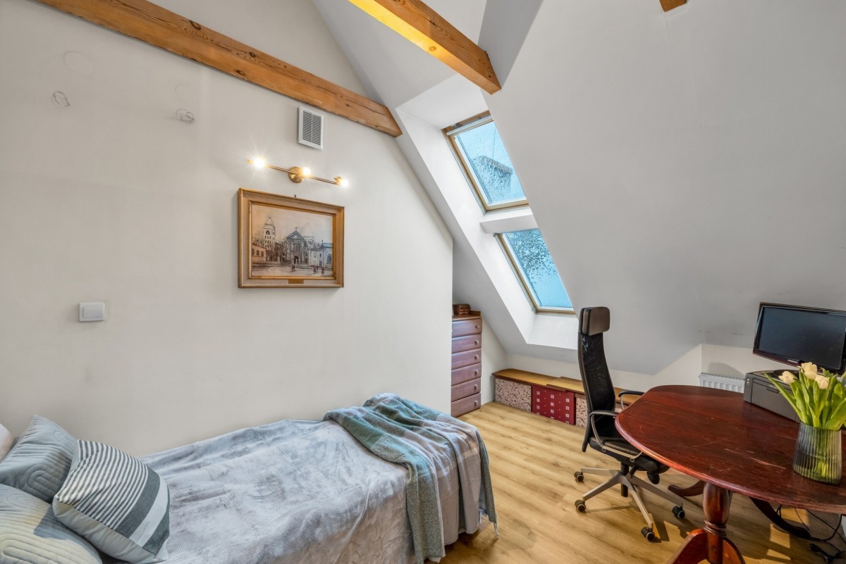 Na drugim poziomie jest zamknięty pokój oraz otwarta, widna przestrzeń (z oknami VELUX) zaaranżowana na sypialnię. Najwyższa kondygnacja zapewnia ciszę i prywatność. Podłoga drugiego poziomu pokryta jest panelami.