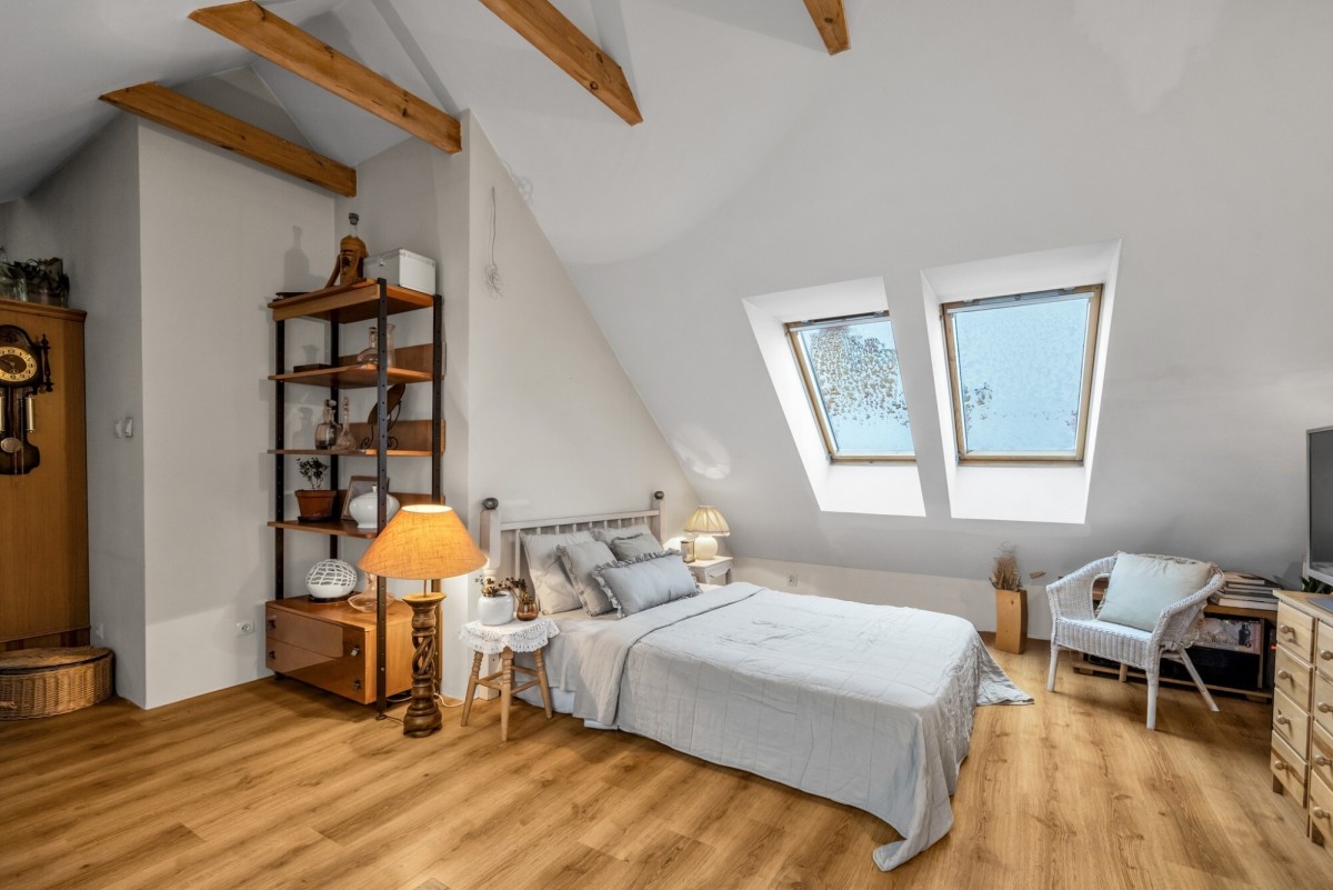 – dębowa podłoga, okna w kolorze jasnego drewna (VELUX) i belki podsufitowe tworzą klimat domku górskiego,