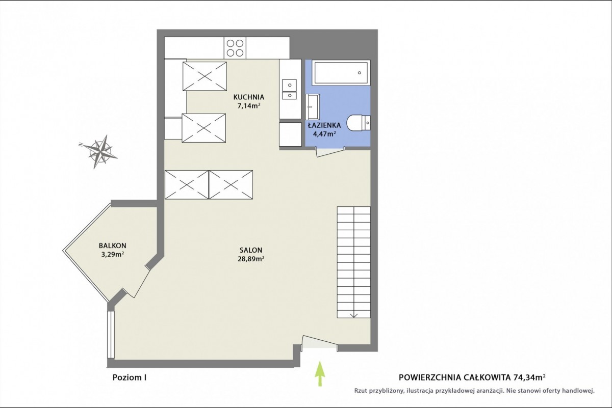 Mieszkanie składa się z dwóch poziomów. Na pierwszym poziomie znajduje się salon połączony z bardzo widnym aneksem kuchennym. Kuchnia wymaga renowacji, nie ma pełnego wyposażenia sprzętowego. Z salonu jest wyjście na balkon, z którego roztacza się widok na niską zabudowę i pobliski las. Na tym poziomie znajduje się także duża łazienka z wanną. Mieszkanie i woda ogrzewane za pomocą regulowanego samodzielnie pieca gazowego, co daje możliwość dużych oszczędności.