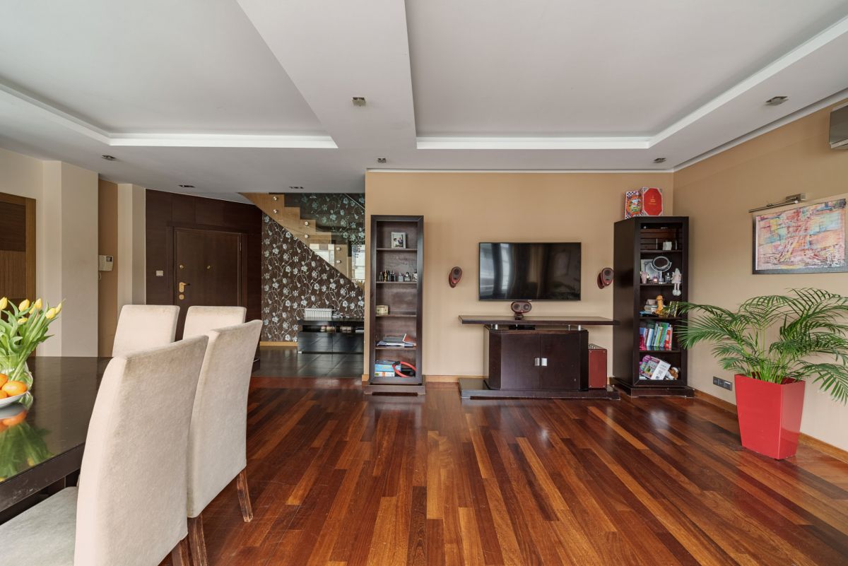 Oferuję na sprzedaż komfortowy, dwupoziomowy apartament z trzema pokojami o powierzchni 121 m², położony przy ulicy Sarmackiej w dzielnicy Wilanów. Lokal znajduje się na ostatnim, trzecim piętrze nowoczesnego apartamentowca z 2008 roku.