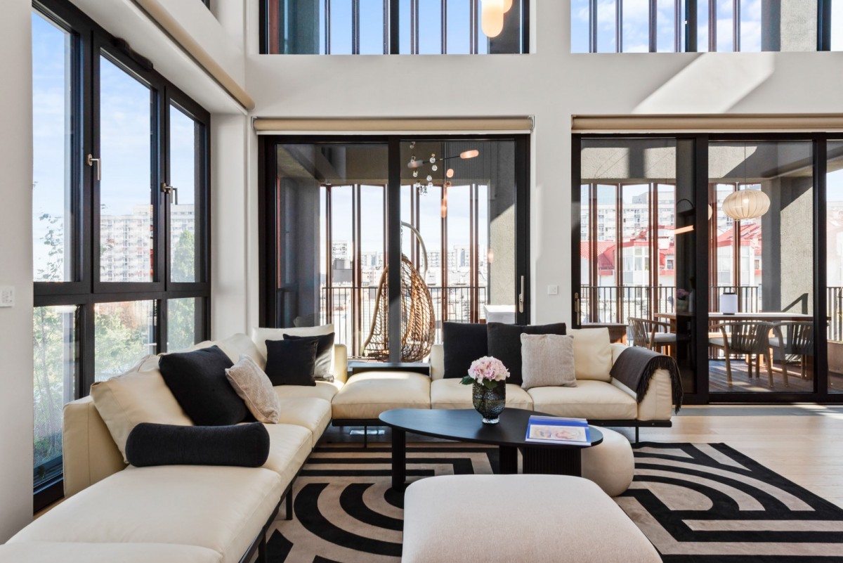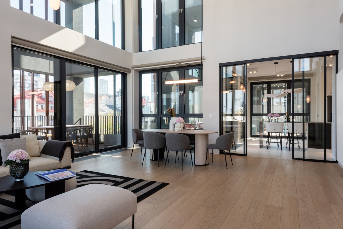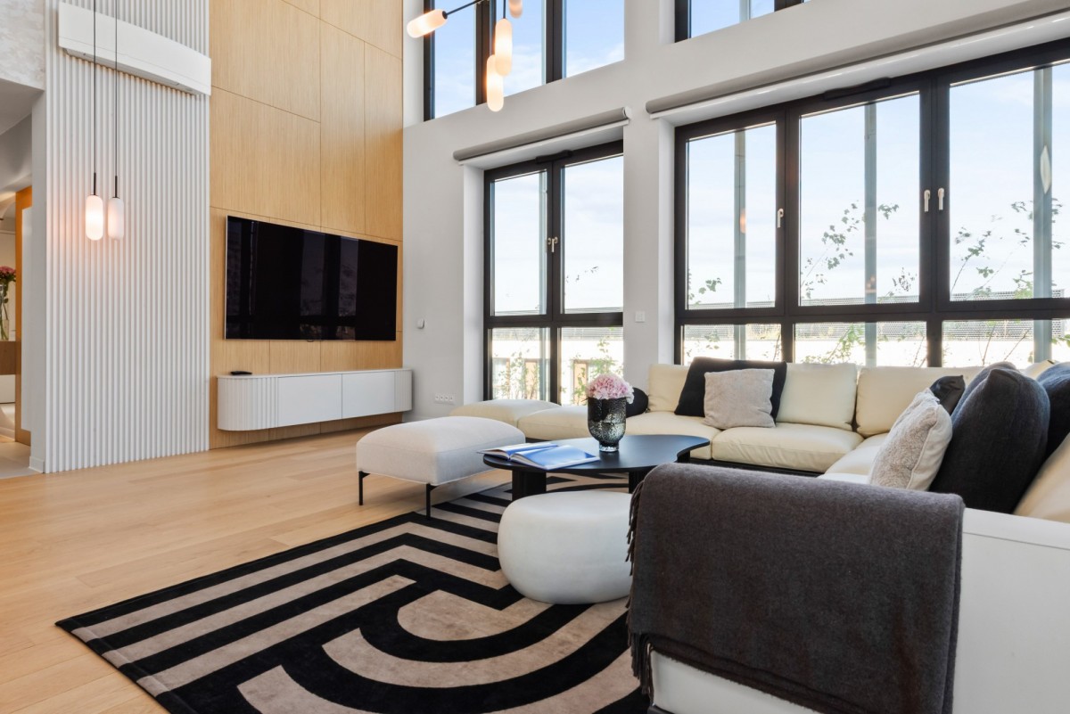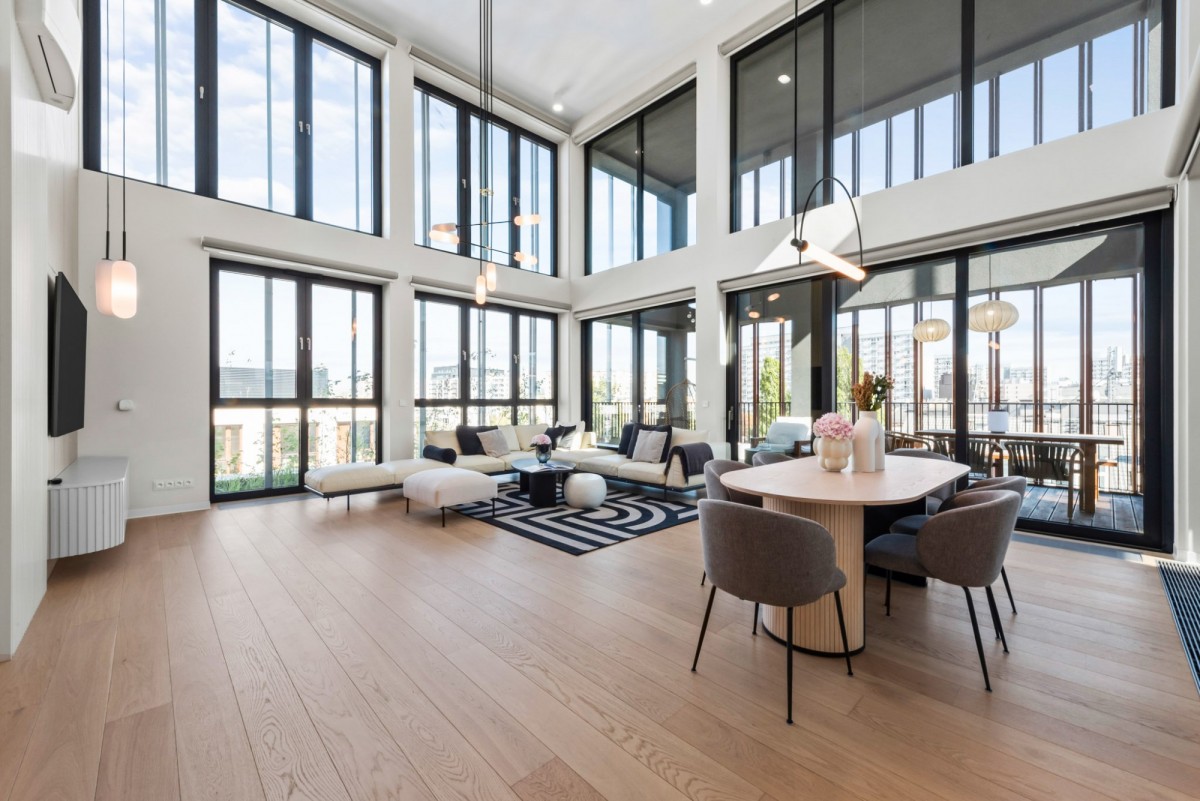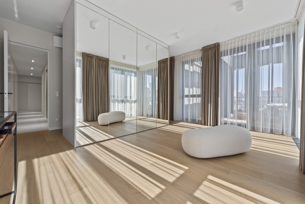 Dwupiętrowy penthouse o powierzchni 271 m2 z trzema dużymi tarasami z widokiem na centrum Warszawy.