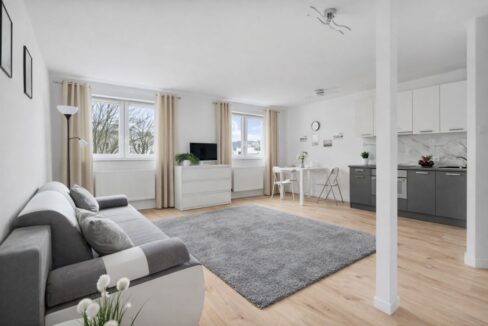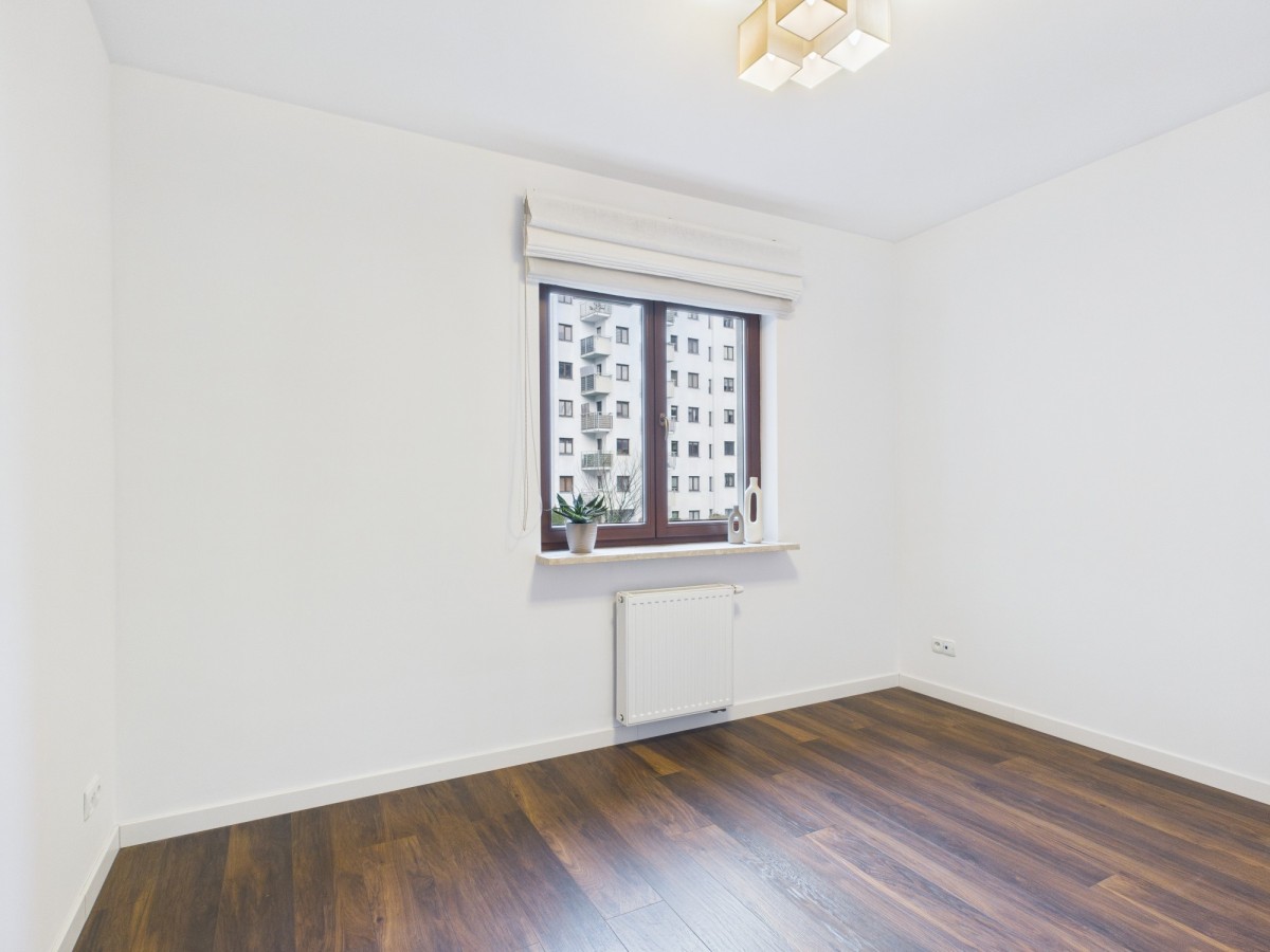 W oknach zamontowano praktyczne, dwuwarstwowe rolety rzymskie (firana + zasłona). Mieszkanie wyposażone jest w sprzęt AGD (zmywarka, lodówka, piekarnik, płyta indukcyjna, okap, pralka).