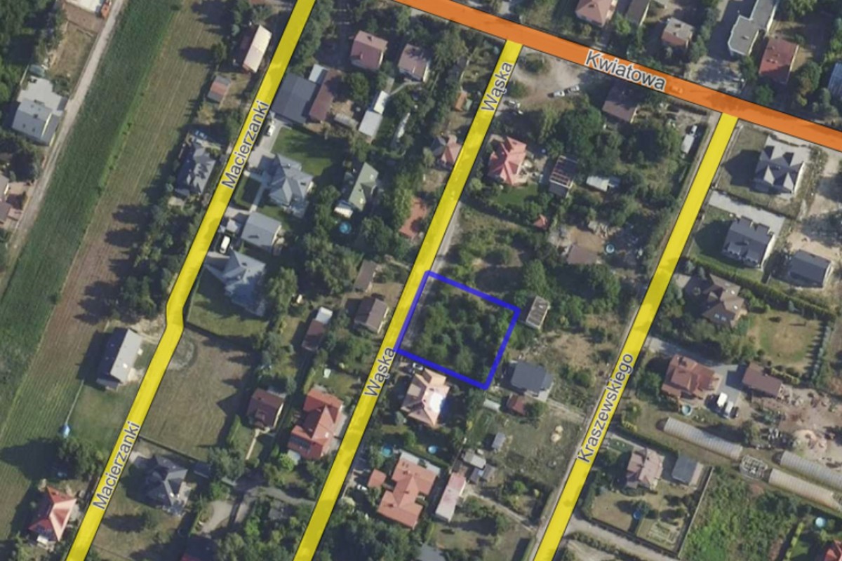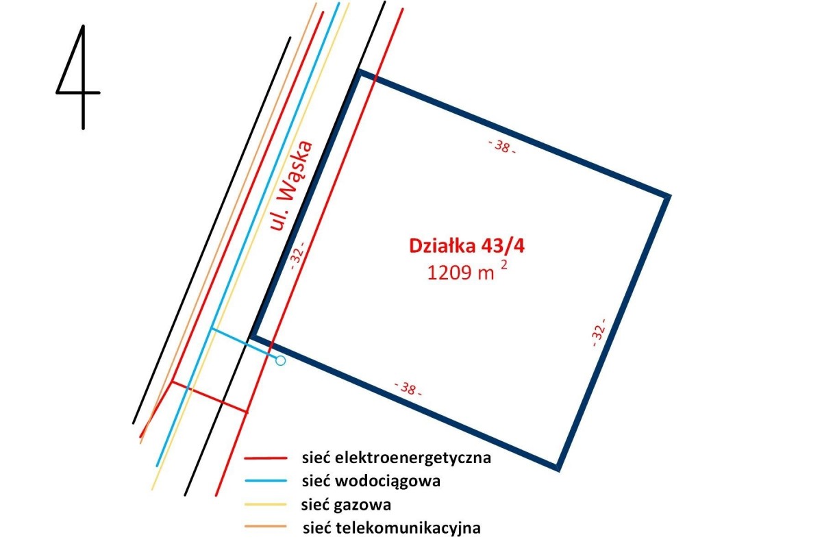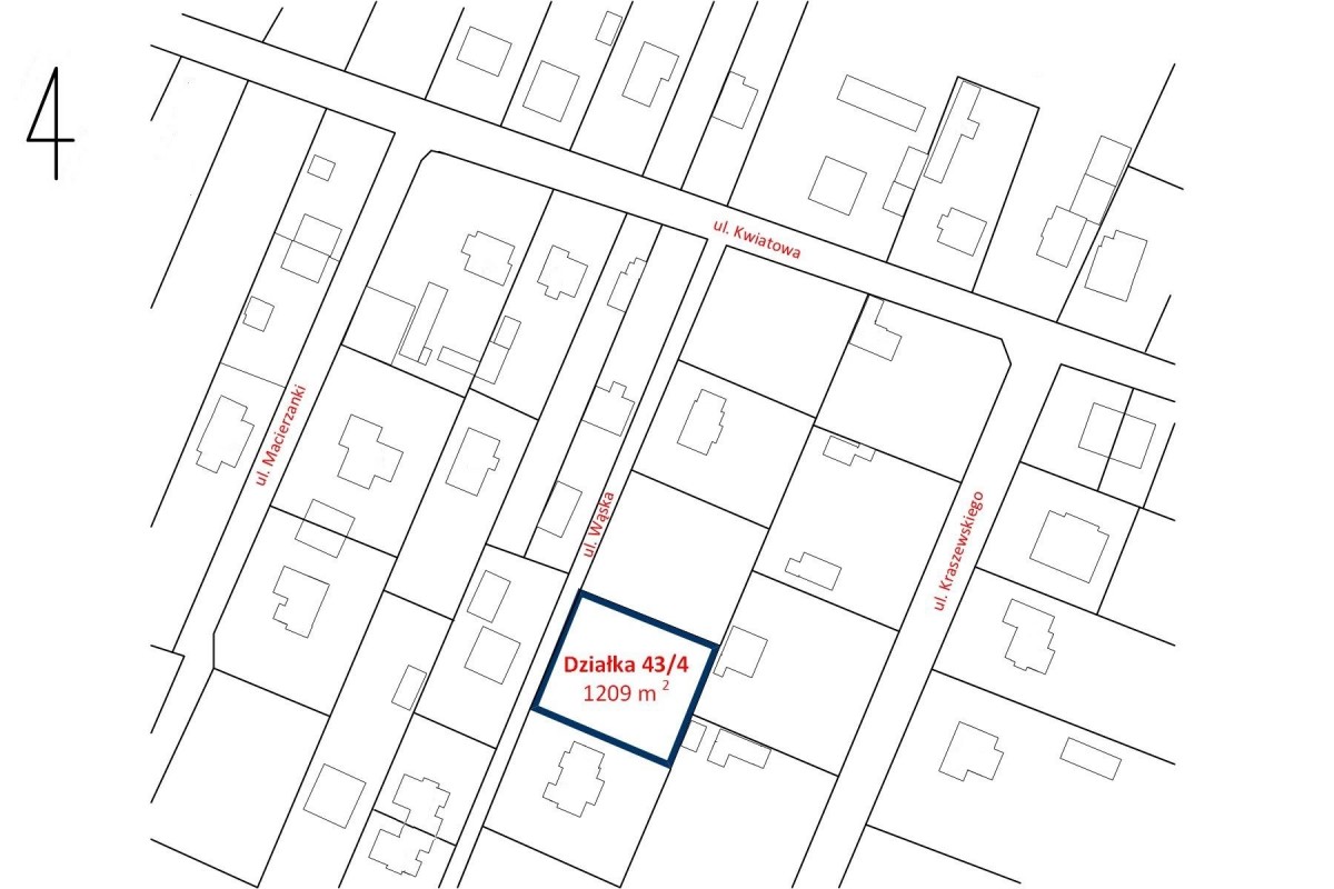 Działka o nr ewid. 43/4, w kształcie prostokąta 32x38m. Lokalizacja w 4 linii zabudowy od ul. Kwiatowej.