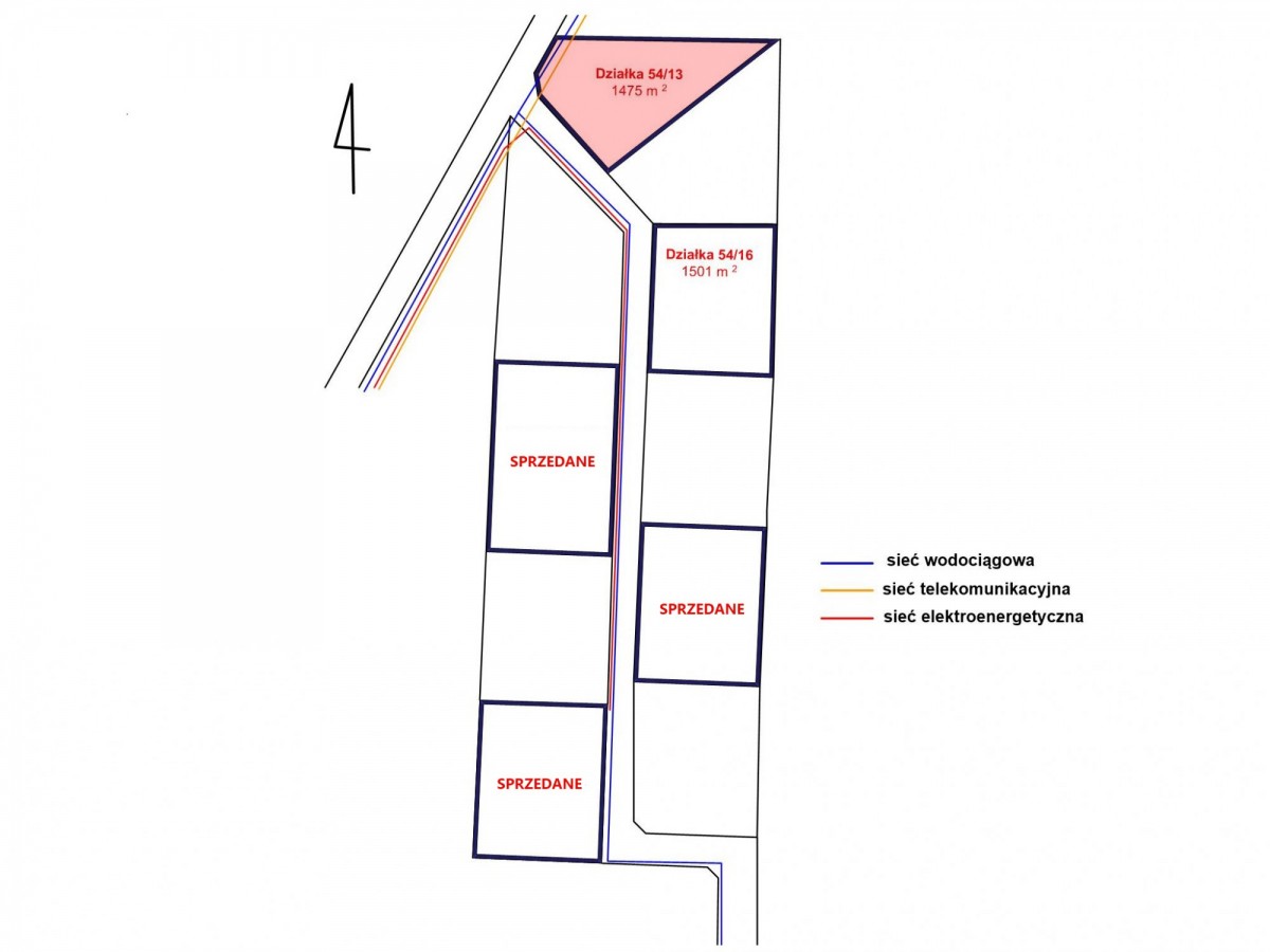 W drodze wewnętrznej, bezpośrednio przy działce znajduje się sieć wodociągowa, energetyczna, światłowodowa.