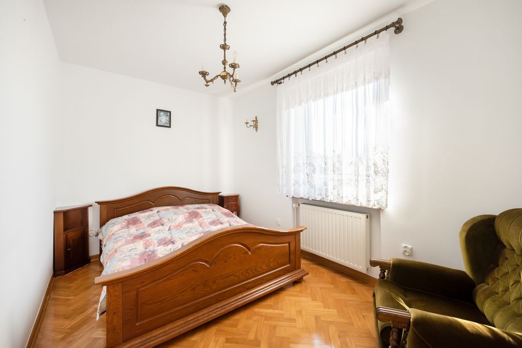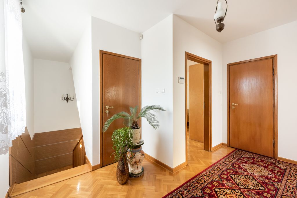 Na 1 piętrze są 3 pokoje od 10 do 16 mkw: sypialnia z wyjściem na balkon, sypialnia gościnna oraz pokój – gabinet. Łazienka z wanną. Wszystkie pomieszczenia łącznie z korytarzem wyłożone są terakotą. W toalecie płytki. Wszystkie pomieszczenia mają duże okna co doskonale doświetla wnętrze.