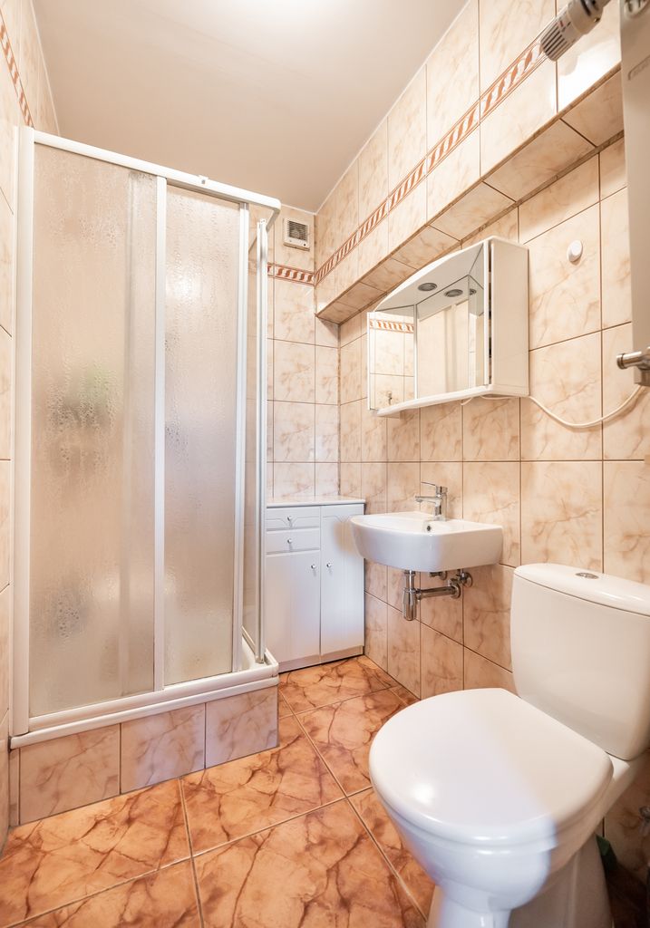 Na parterze znajduje się łazienka z kabiną prysznicową, przestronny, jasny salon oraz oddzielna duża kuchnia z jadalnią. Parter wyłożony terakotą, za wyjątkiem łazienki i części kuchni wyłożonej płytkami. W salonie piękny parkiet.