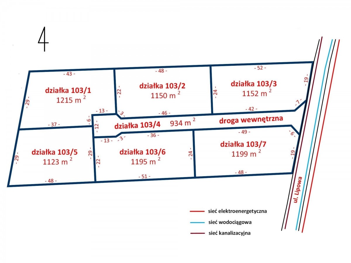 Działka ma wymiary 24 x 48, znajduje się w drugiej linii zabudowy od ul. Lipowej – asfaltowej drogi gminnej, co zapewnia wygodny i bezpośredni dojazd. Podana cena dotyczy działki wraz z udziałem w drodze wewnętrznej nr. ewid. 103/4.
