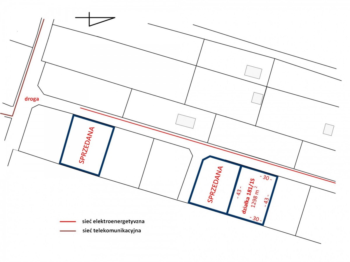 Sieć energetyczna w drodze przy działce – po drugiej stronie drogi znajduje się skrzynka energetyczna. W odległości ok 50m działka zabudowana domem jednorodzinnym.