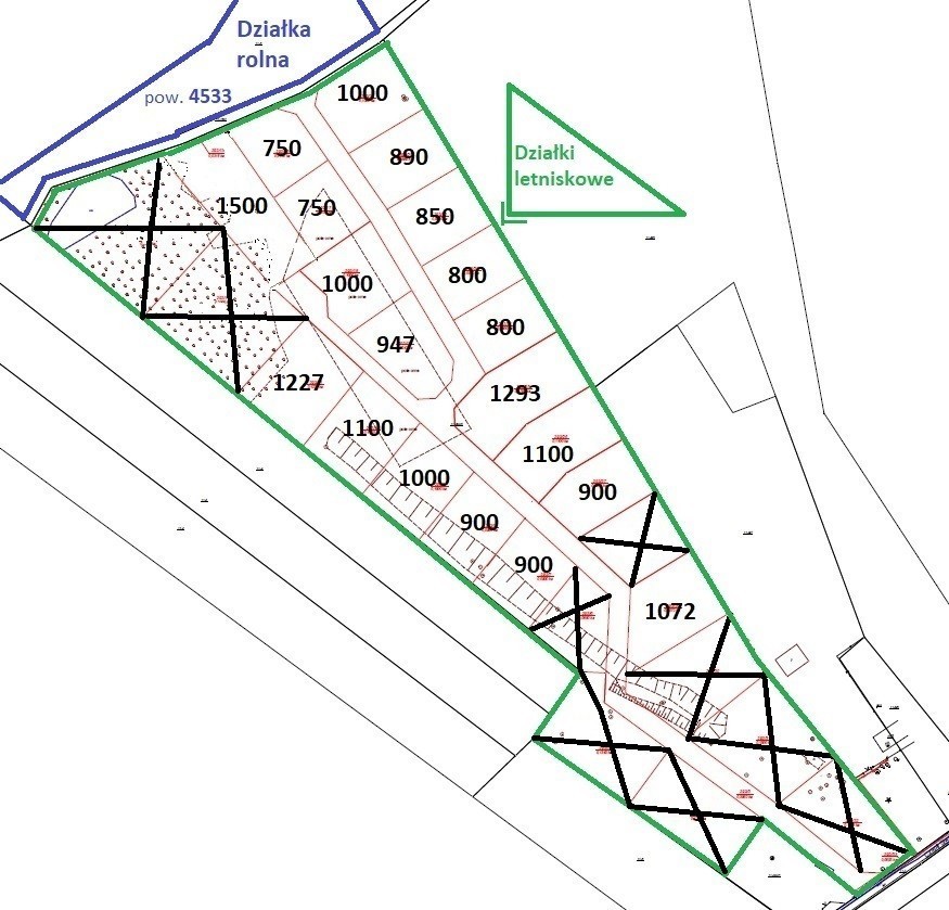Uwaga, w sprzedaży są jeszcze działki o powierzchni od 800 do 1500 mkw (cena od 60 do 77 zł/mkw). Na załączonym grafie zaznaczono jeszcze dostępne działki.