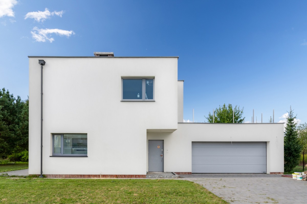 Na terenie posesji znajduje się garaż dwustanowiskowy z bezpośrednim dostępem do wnętrza domu, a przed nim przewidziano dodatkowe miejsce parkingowe na trzeci samochód.