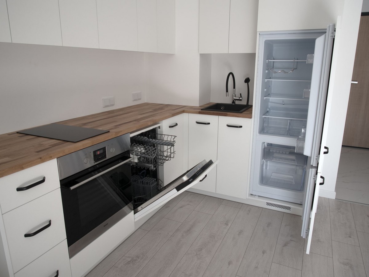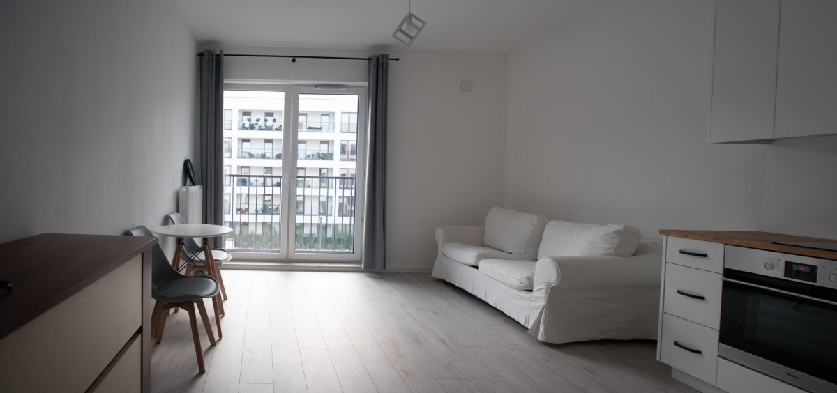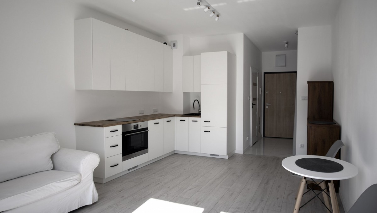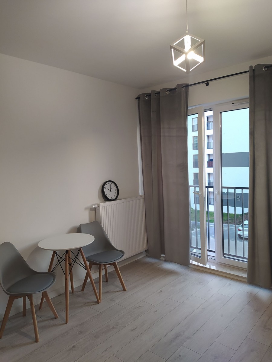 Mieszkanie w pełni wyposażone i gotowe do zamieszkania o ekspozycji zachodniej. Panoramiczne okna zapewniają dużo światła w mieszkaniu. W salonie znajdziemy sofę z funkcją spania, stół oraz dwa krzesła. Meble kuchenne białe, blat dębowy, całość robiona na zamówienie. Lodówka i zmywarka w zabudowie, oraz piekarnik i płyta indukcyjna