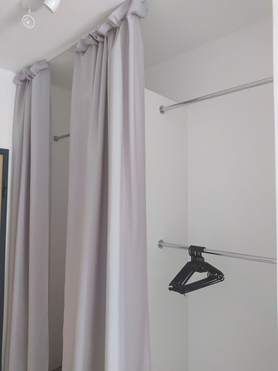 W korytarzu duża wnęka, która to pełni role szafy. W środku mamy odkurzacz, deskę do prasowania, drabinę, półki, oraz drążki na wieszaki.