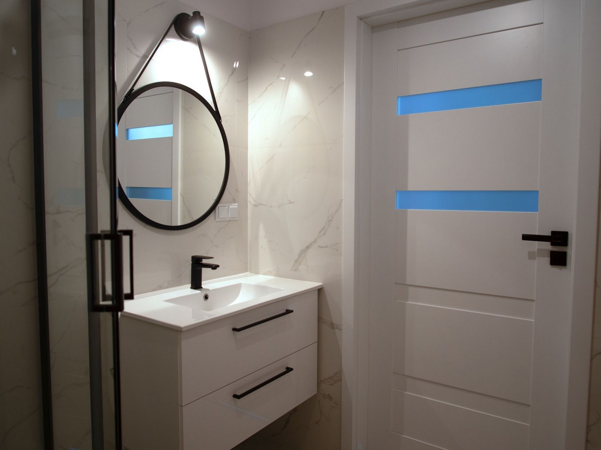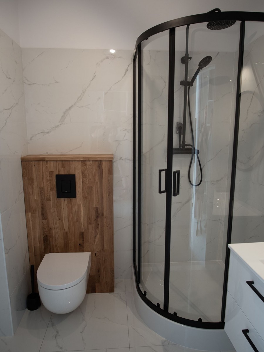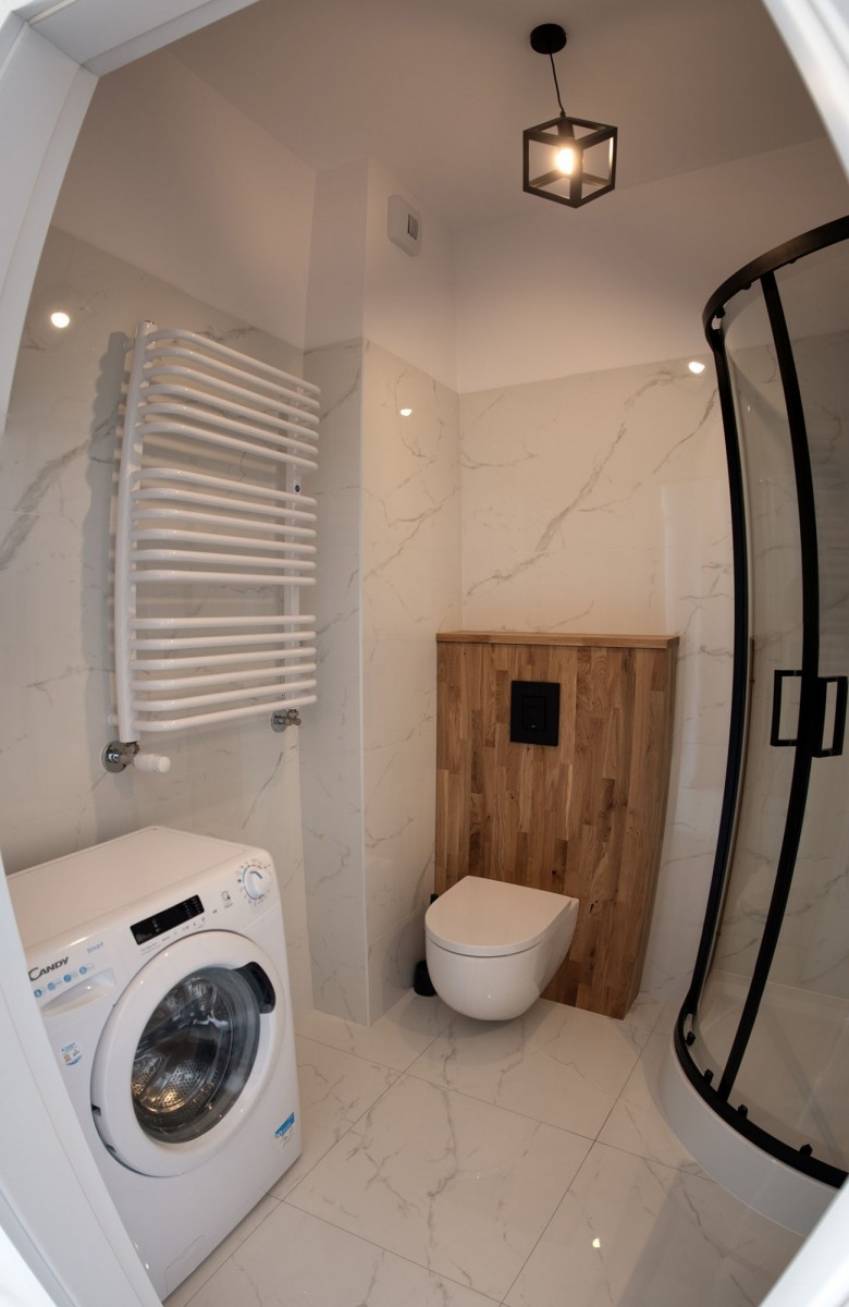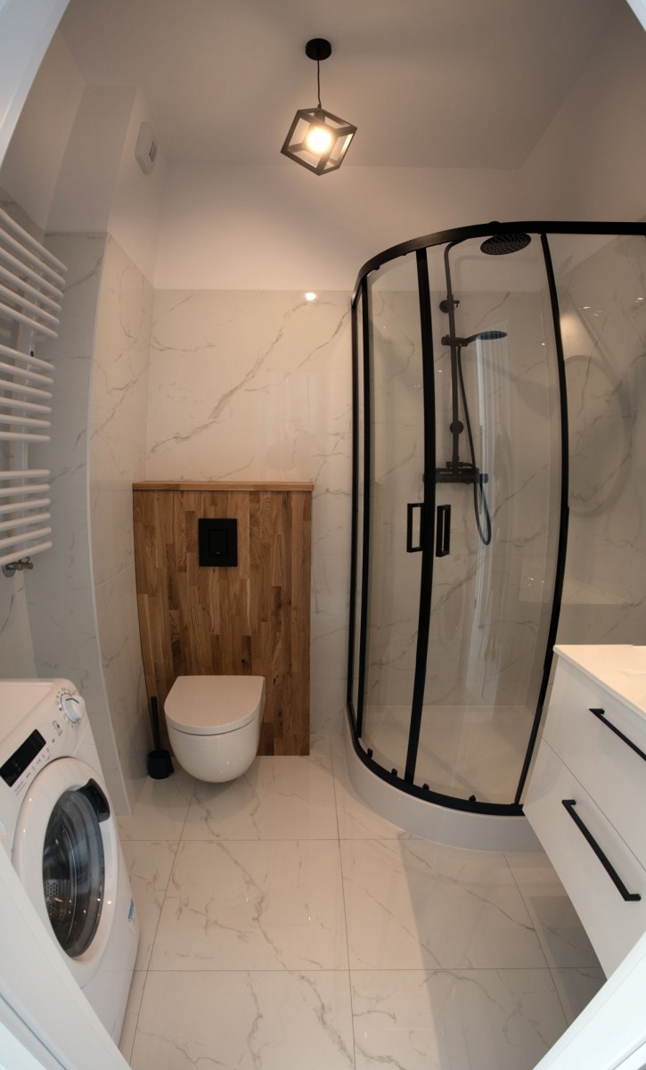 Łazienka w nowoczesnym stylu, która tworzy jednolitą całość z mieszkaniem. Modne białe płytki, kabina prysznicowa z czarnym obramowaniem i armaturą, oraz elementy dębowe. Na wyposażeniu łazienki mamy pralkę.