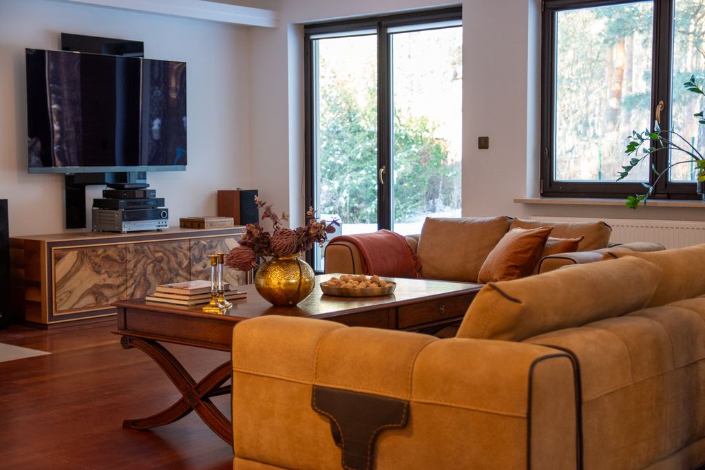 Nieruchomość wykończona w wysokim standardzie, z dbałością o funkcjonalność, estetykę i komfort codziennego życia. To ergonomiczny i ekonomiczny dom, położony w niezwykle urokliwej i spokojnej okolicy — z Mazowieckim Parkiem Krajobrazowym tuż za oknem.